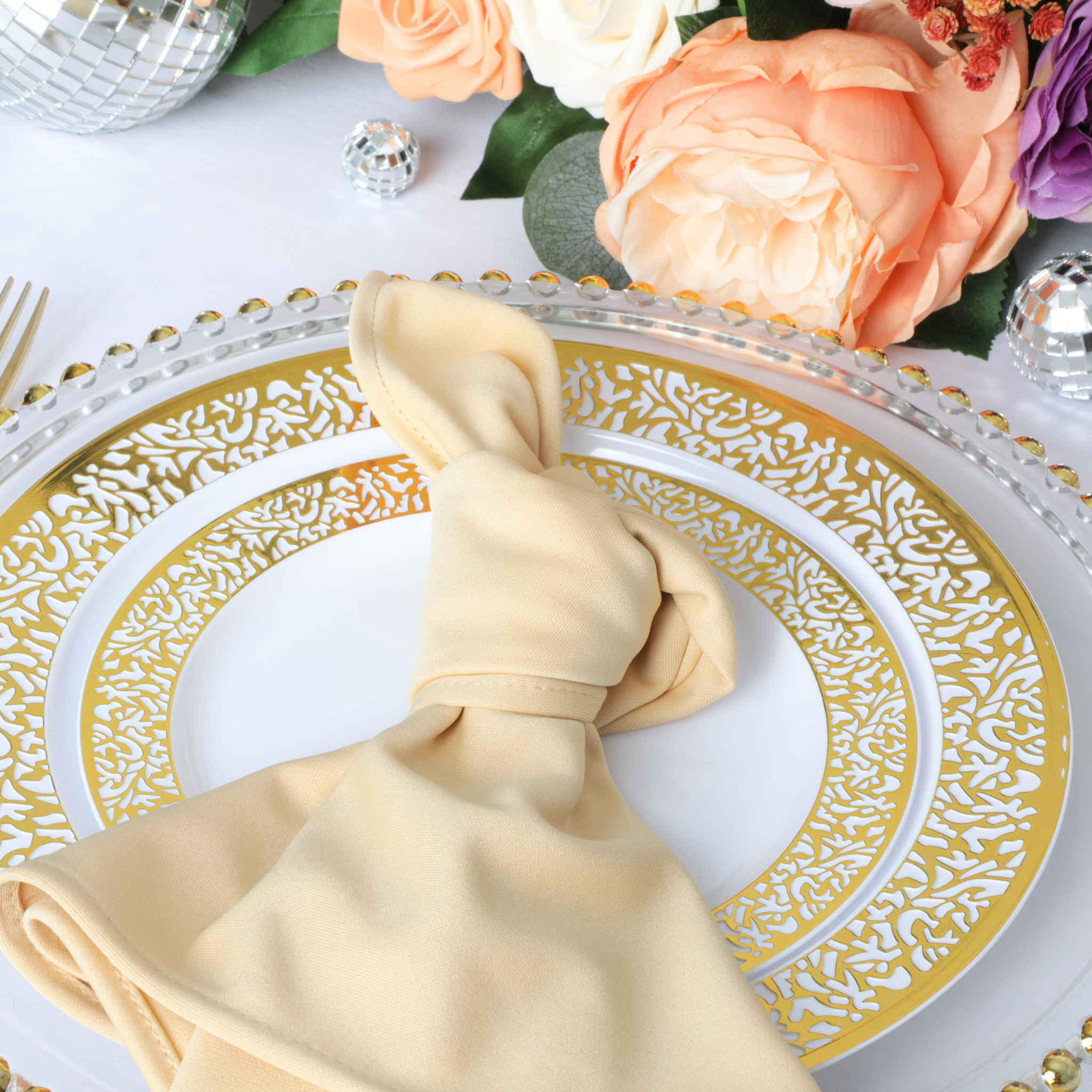 Pair our Champagne event linens for sale with white polyester tablecloths in bulk and silver or gold accents for a classic and timeless look. You can also try different napkin folding techniques to add sophistication and set the table for a formal and refined atmosphere.