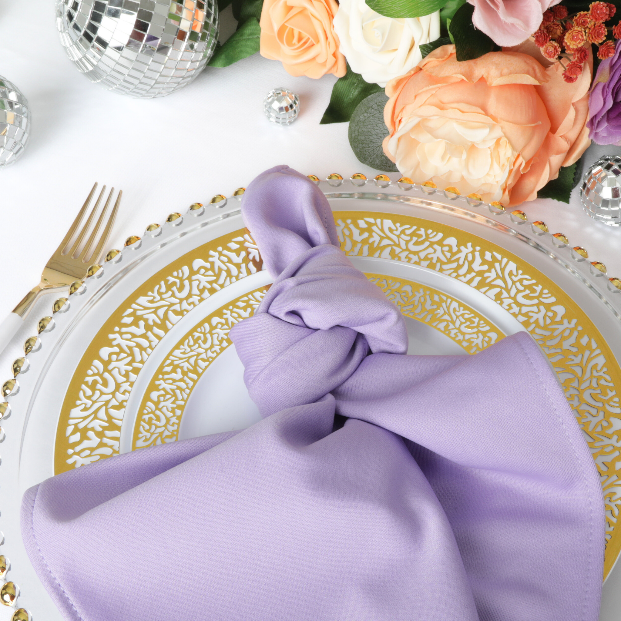 Made of Lavender scuba material, our 20 x 20 inch napkins come in a pack of five for easy event coordination.