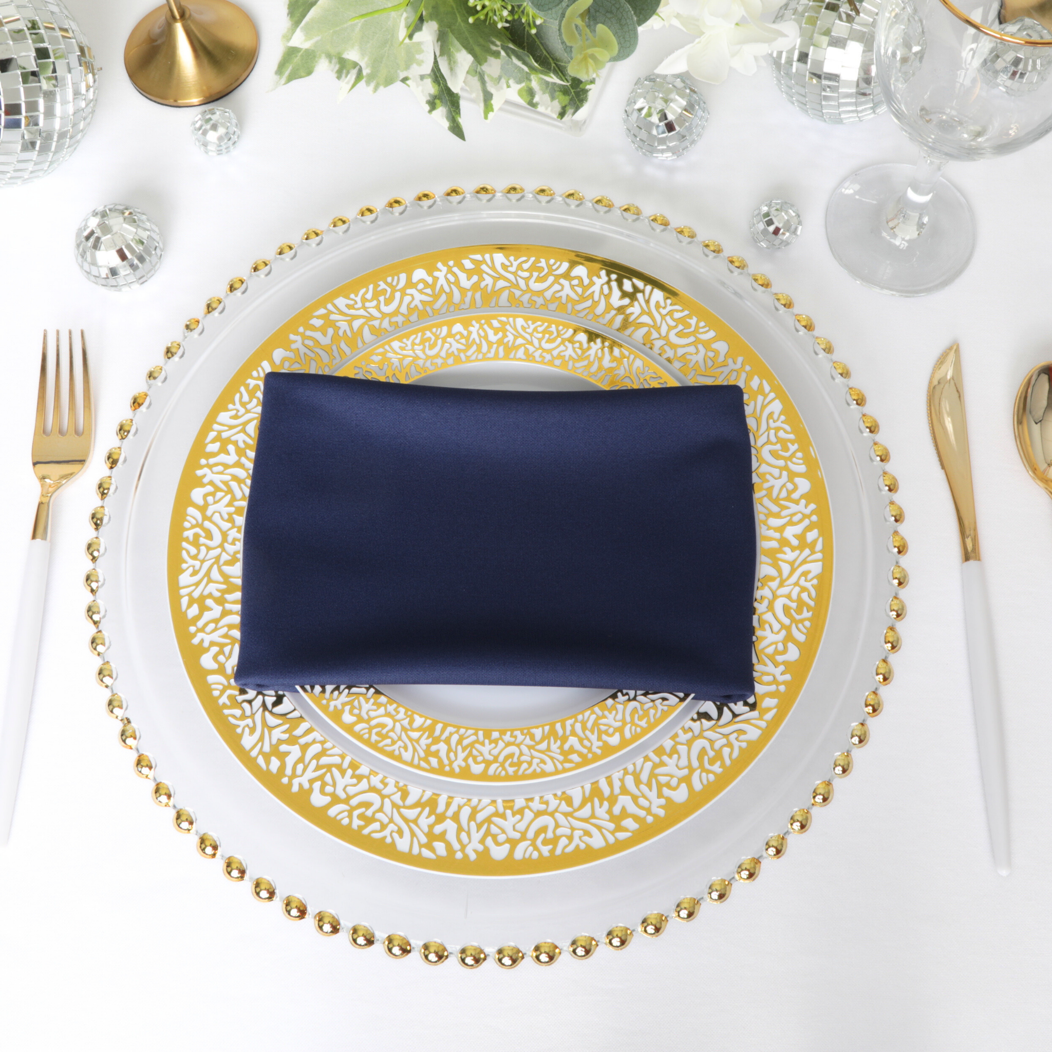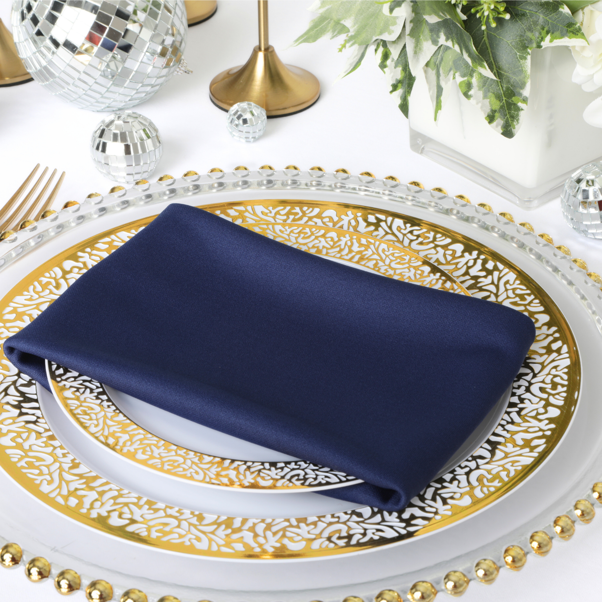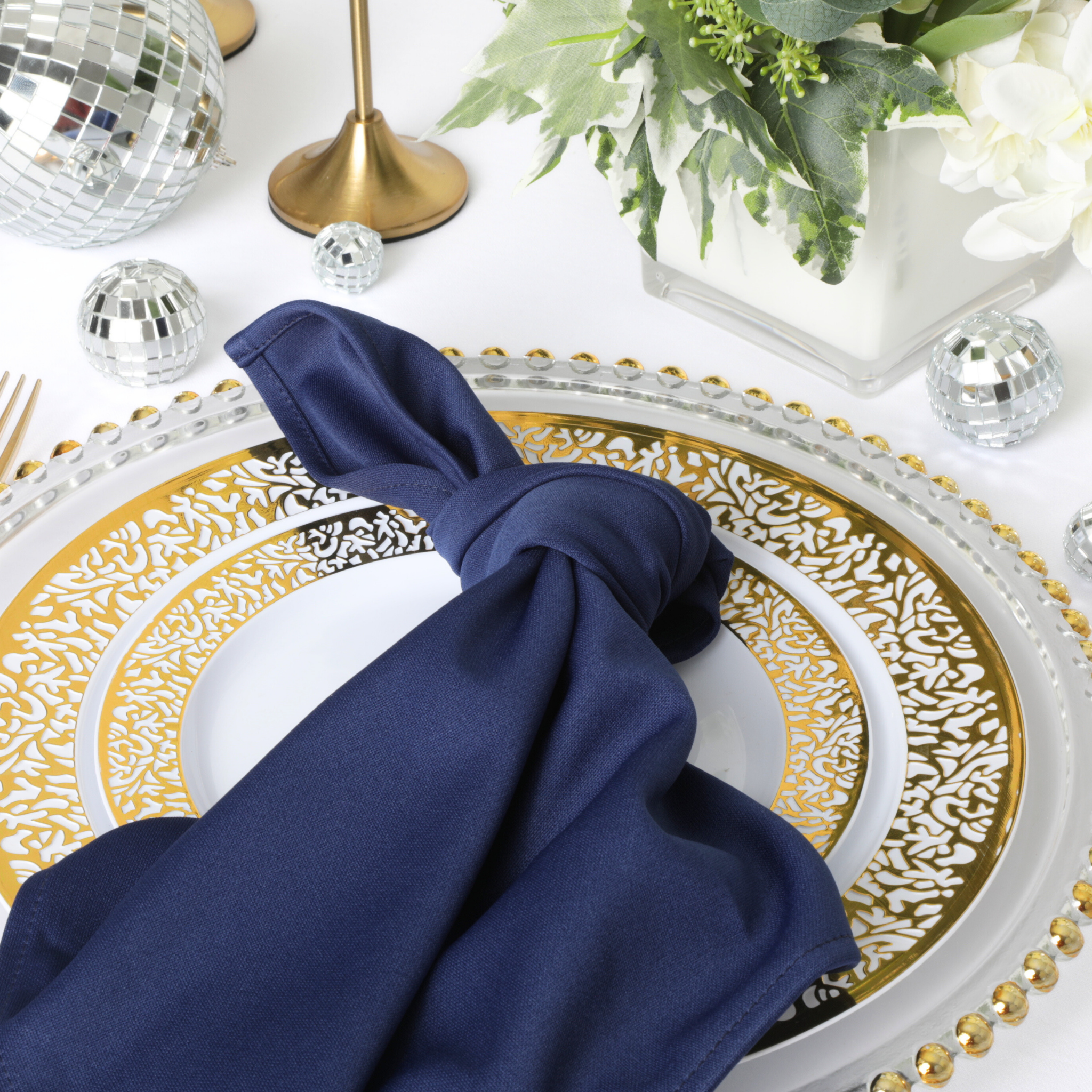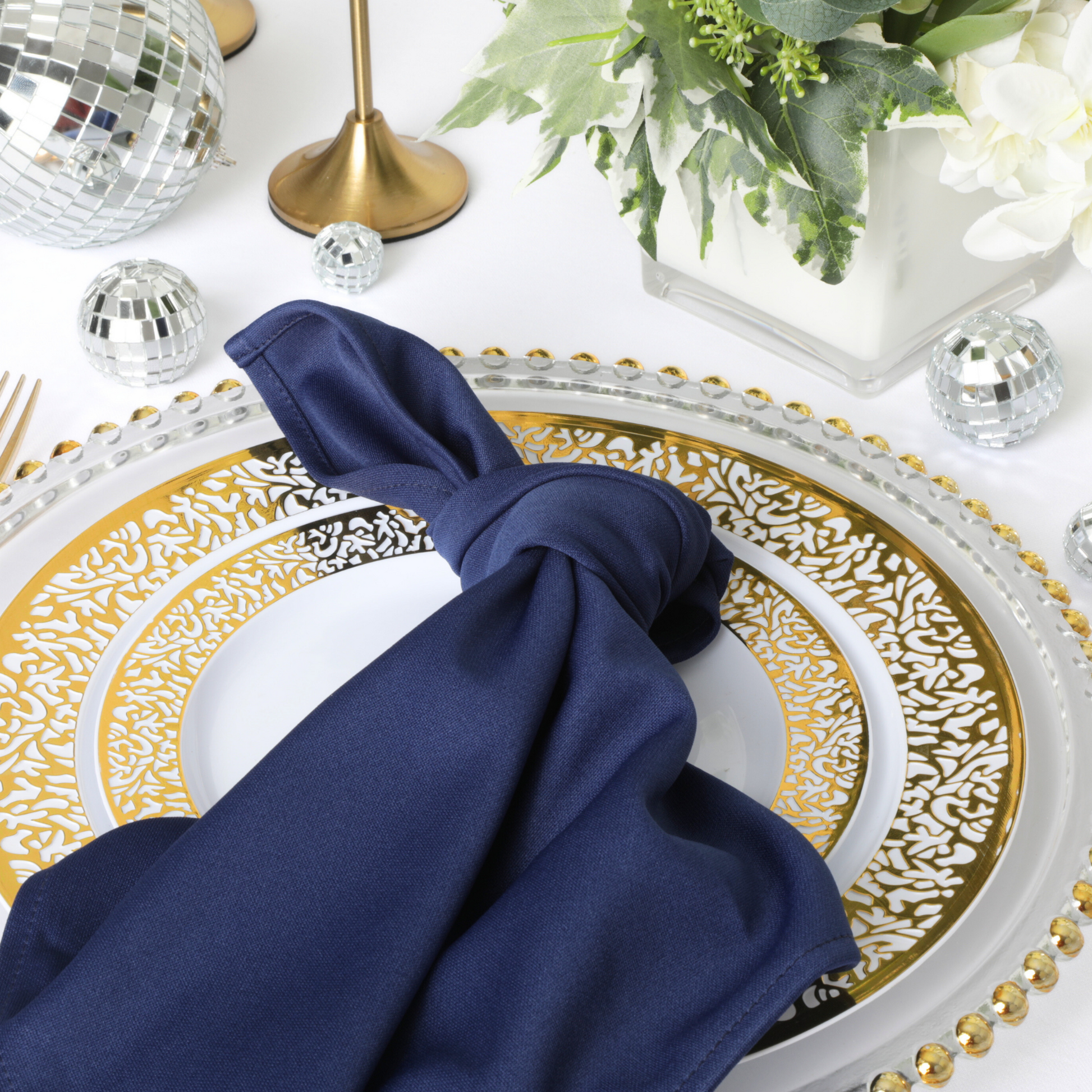 Pair our Navy Blue event linens for sale with white polyester tablecloths in bulk and silver or gold accents for a classic and timeless look. You can also try different napkin folding techniques to add sophistication and set the table for a formal and refined atmosphere.