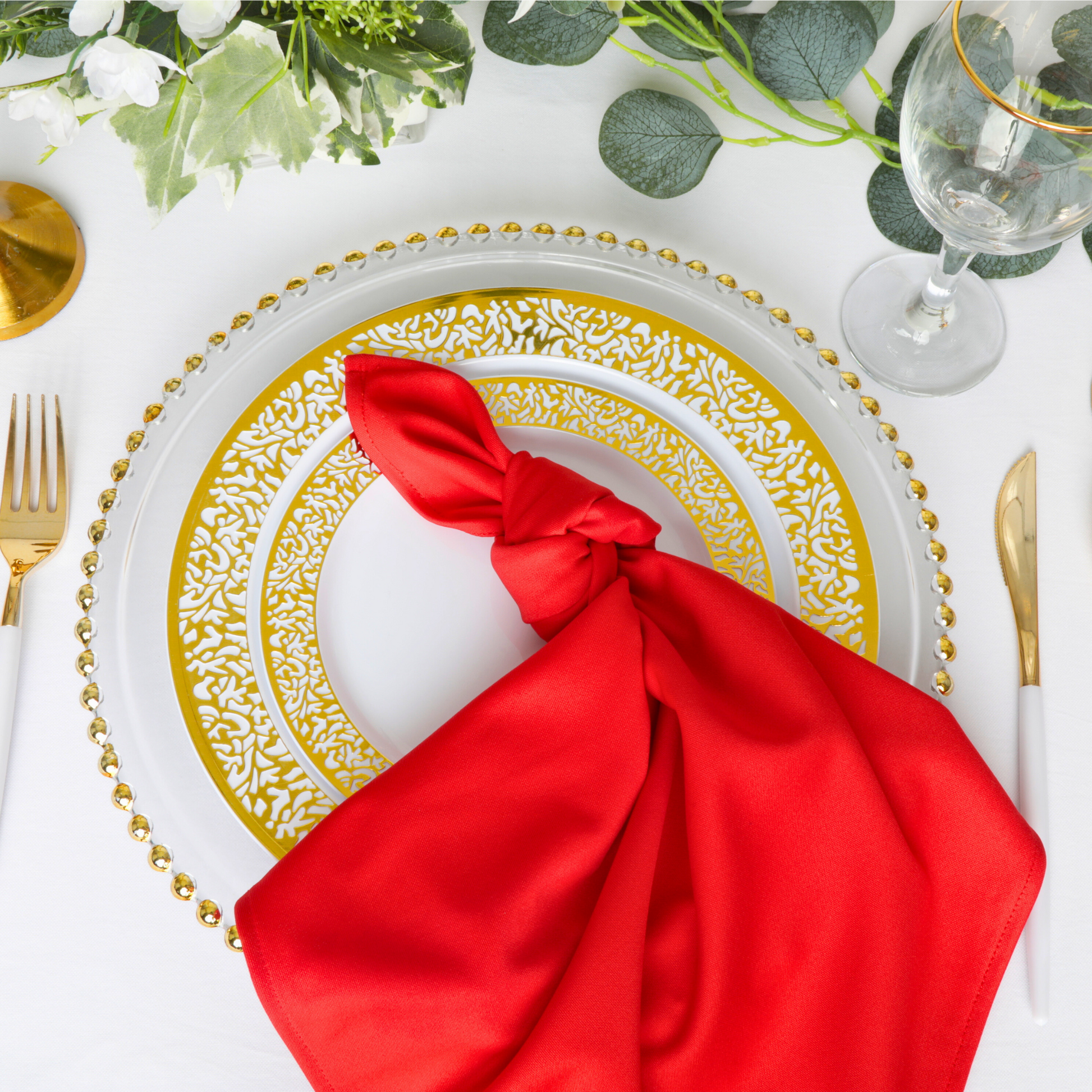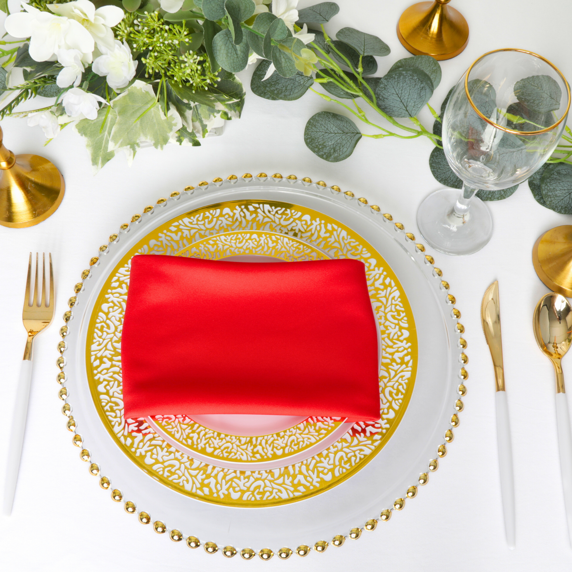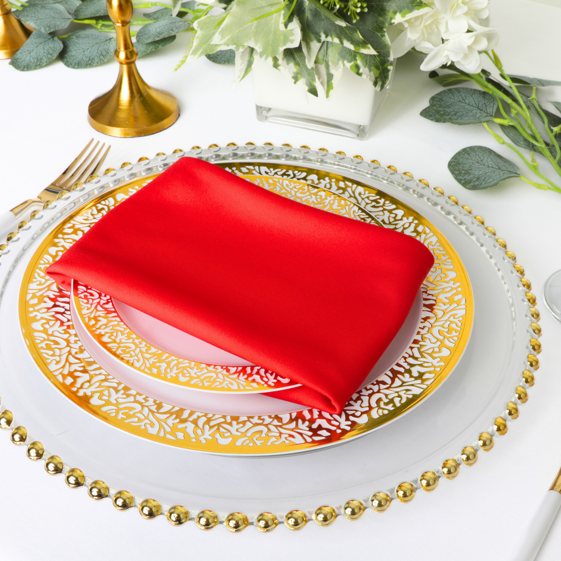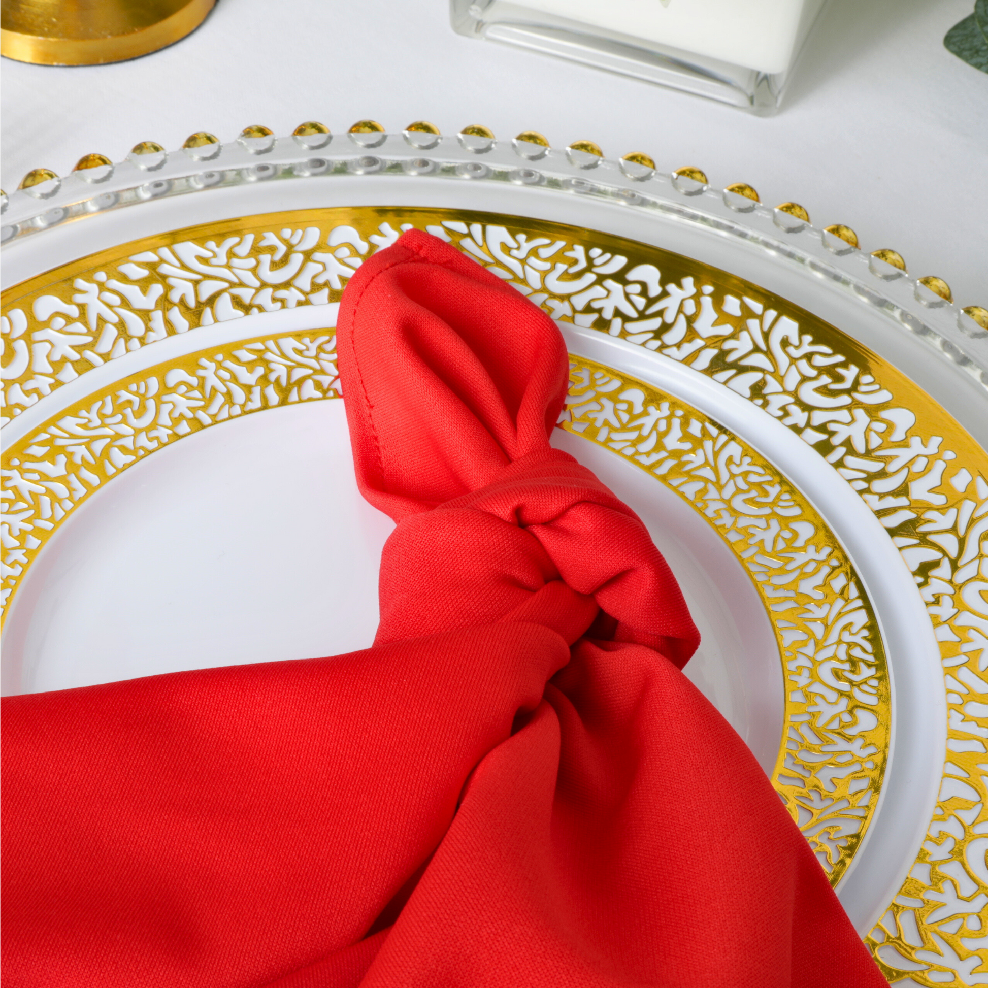 Pair our Red event linens for sale with white polyester tablecloths in bulk and silver or gold accents for a classic and timeless look. You can also try different napkin folding techniques to add sophistication and set the table for a formal and refined atmosphere.