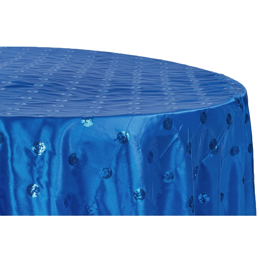 Add a touch of sparkle with our Royal Blue Sequin Embroidery Taffeta 120 Round Tablecloth! Made from our luxurious taffeta embroidered with a patterned grid, the embroidered line intersections on this design are marked with beautiful sequined two-inch circles. The circles feature our famous glitz sequins that overlap to reduce plain areas and truly shine.