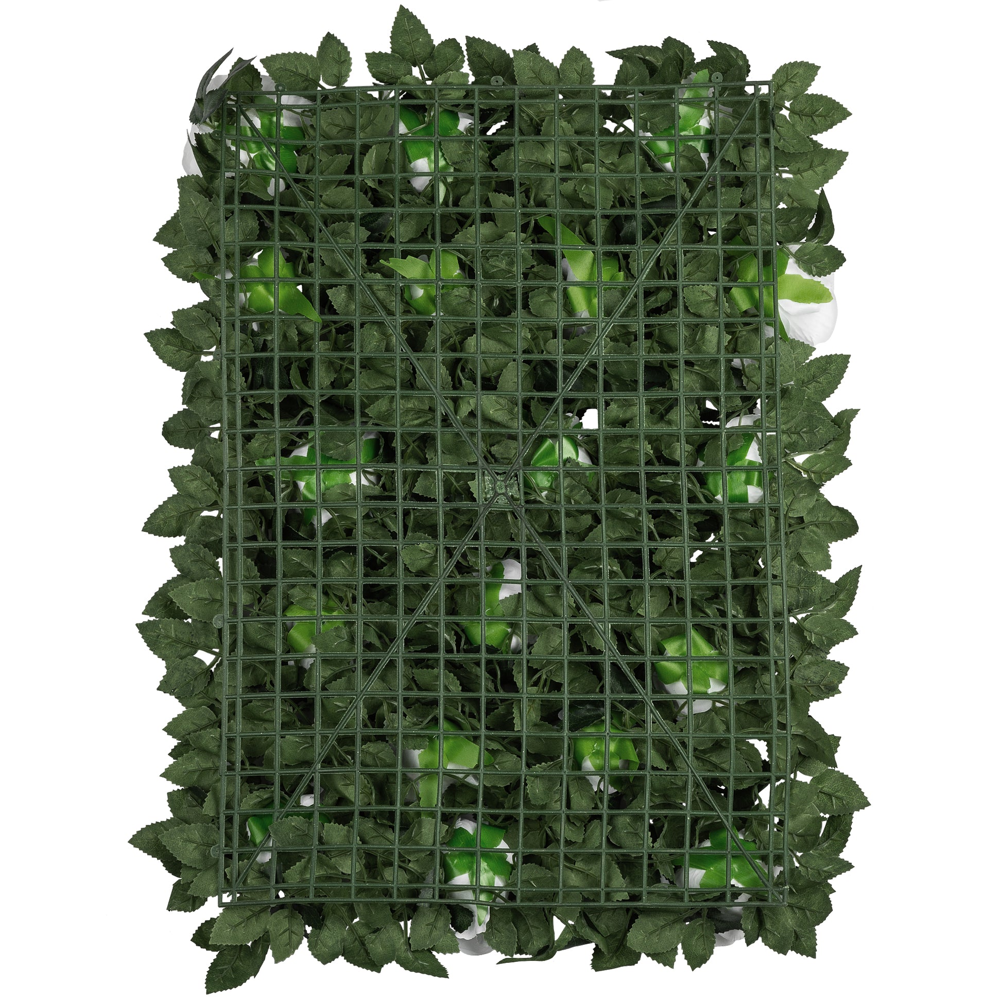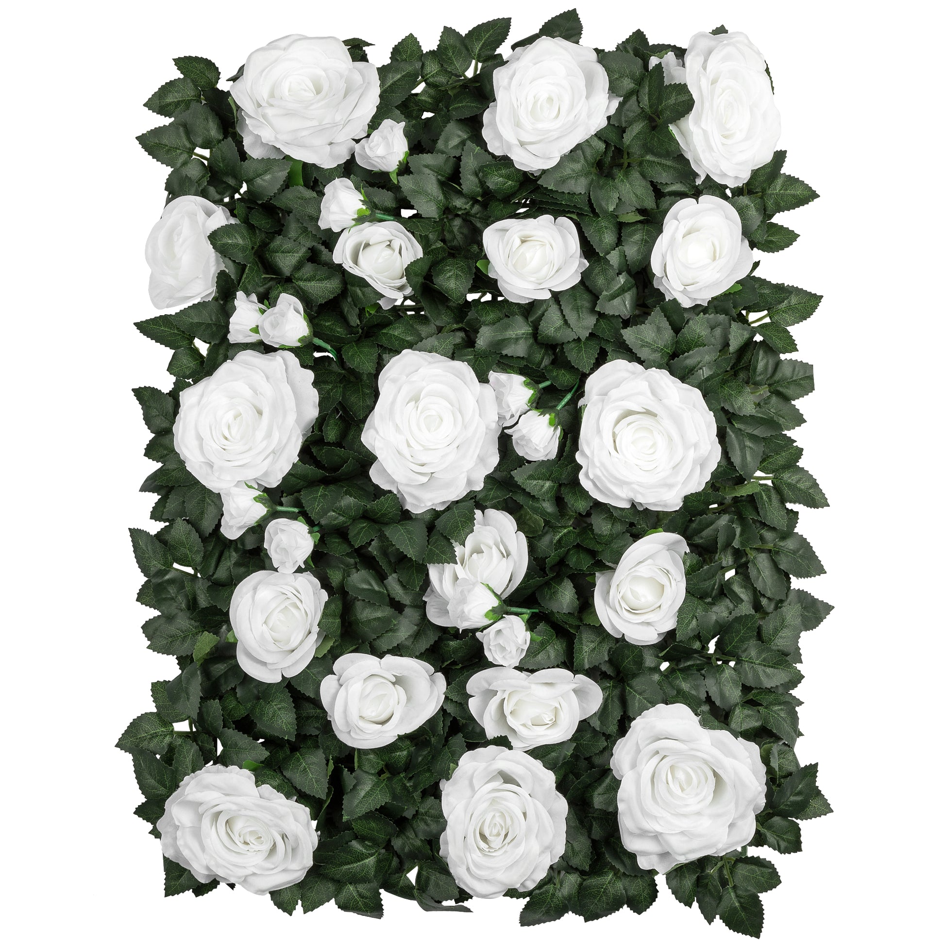 Many people like the look of a flower wall, but the cost of fresh flowers can be enormous! If a fresh flower wall doesn't fall within your budget, try our Silk Greenery with Roses Flower Wall Backdrop Panels. Each panel is carefully constructed from beautiful, realistic-looking silk roses surrounded by greeneries that will provide a contemporary and luxurious touch to your event. The silk roses and greeneries are connected to a plastic grid backing that is durable and bendable. Each panel measures approx. 16" x 24".