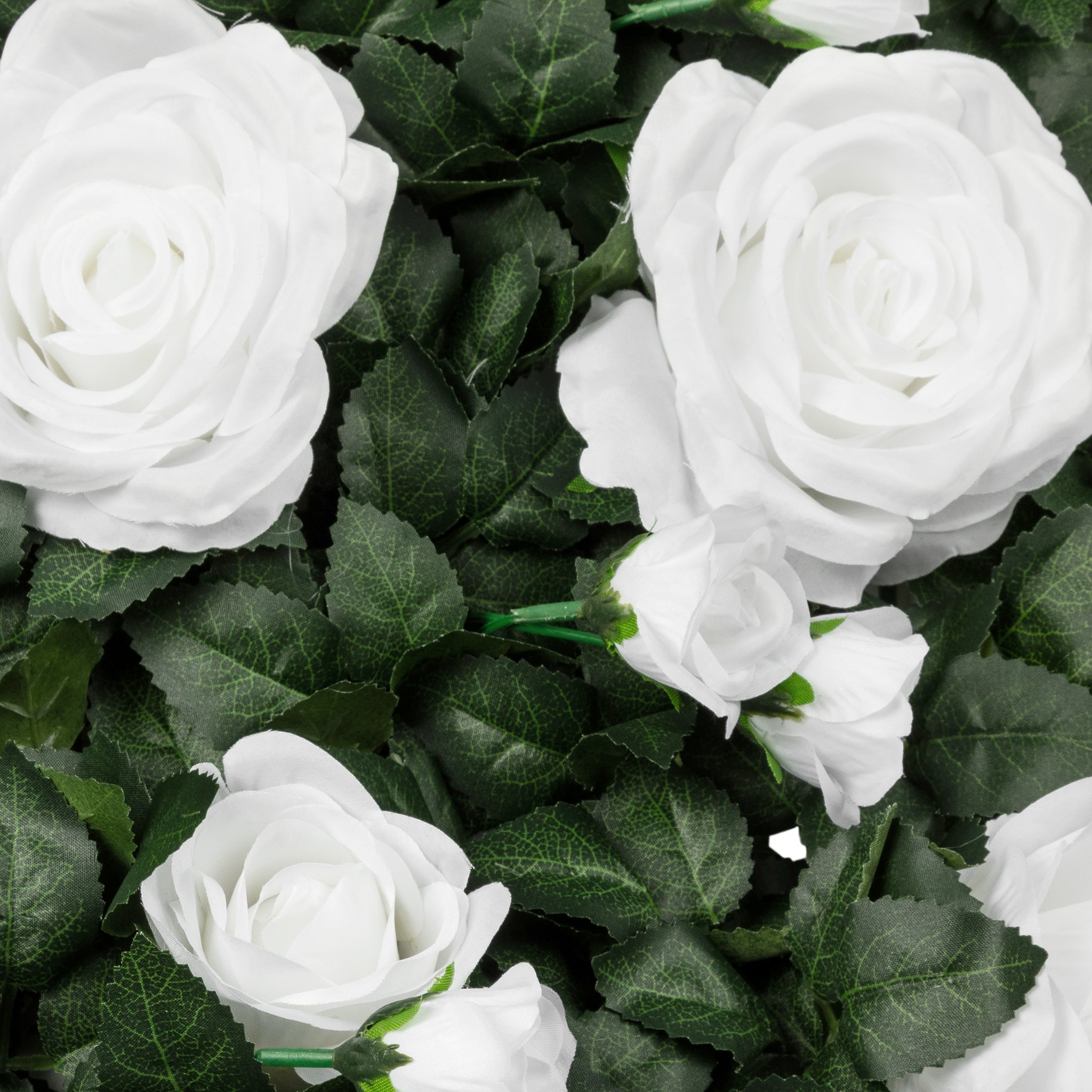 Worried about set up? Don't be! Assembling our Silk Greenery with Roses Flower Wall Backdrop Panels couldn't be easier. Before purchasing, measure out the footage of the space you'd like to cover. Once you have the total area order how many panels you'll need to cover up the area. As mentioned, our panels feature a bendable plastic grid backing, so cutting them down to size is no challenge with a pair of scissors. Once your panels are prepped simply use temporary hooks, nails, thumbtacks, a staple gun, or an iron net with ties to fully assemble. The method you use to hang your Silk Greenery with Roses Flower Wall Backdrop Panels will depend on your personal preference and backing.