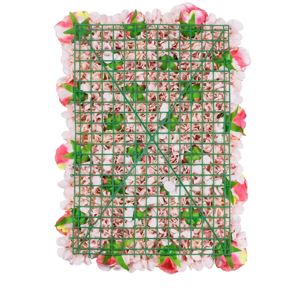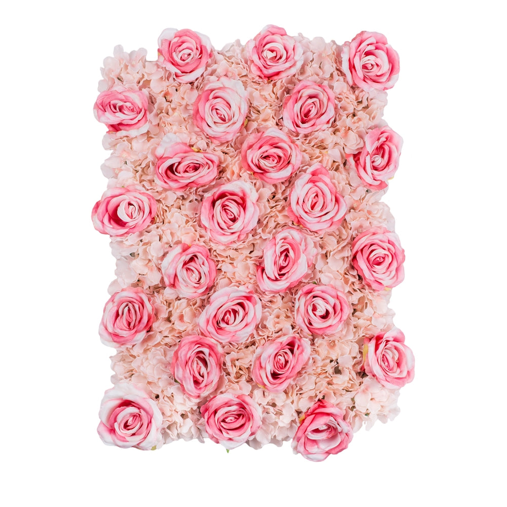 Many people like the look of a flower wall, but the cost for fresh flowers can be enormous! If a fresh flower wall doesn't fall within your budget, try our Silk Roses/Hydrangeas Flower Wall Backdrop Panels. Each panel is carefully constructed from beautiful, realistic-looking silk roses and hydrangeas that will provide a contemporary and luxurious touch to your event. The silk roses and hydrangeas are connected to a plastic grid backing that is durable and bendable. Each Silk Roses/Hydrangeas Flower Wall Backdrop Panel measures approx. 16" x 24" with flowers that sit closely together so there is no room for obvious space gaps.