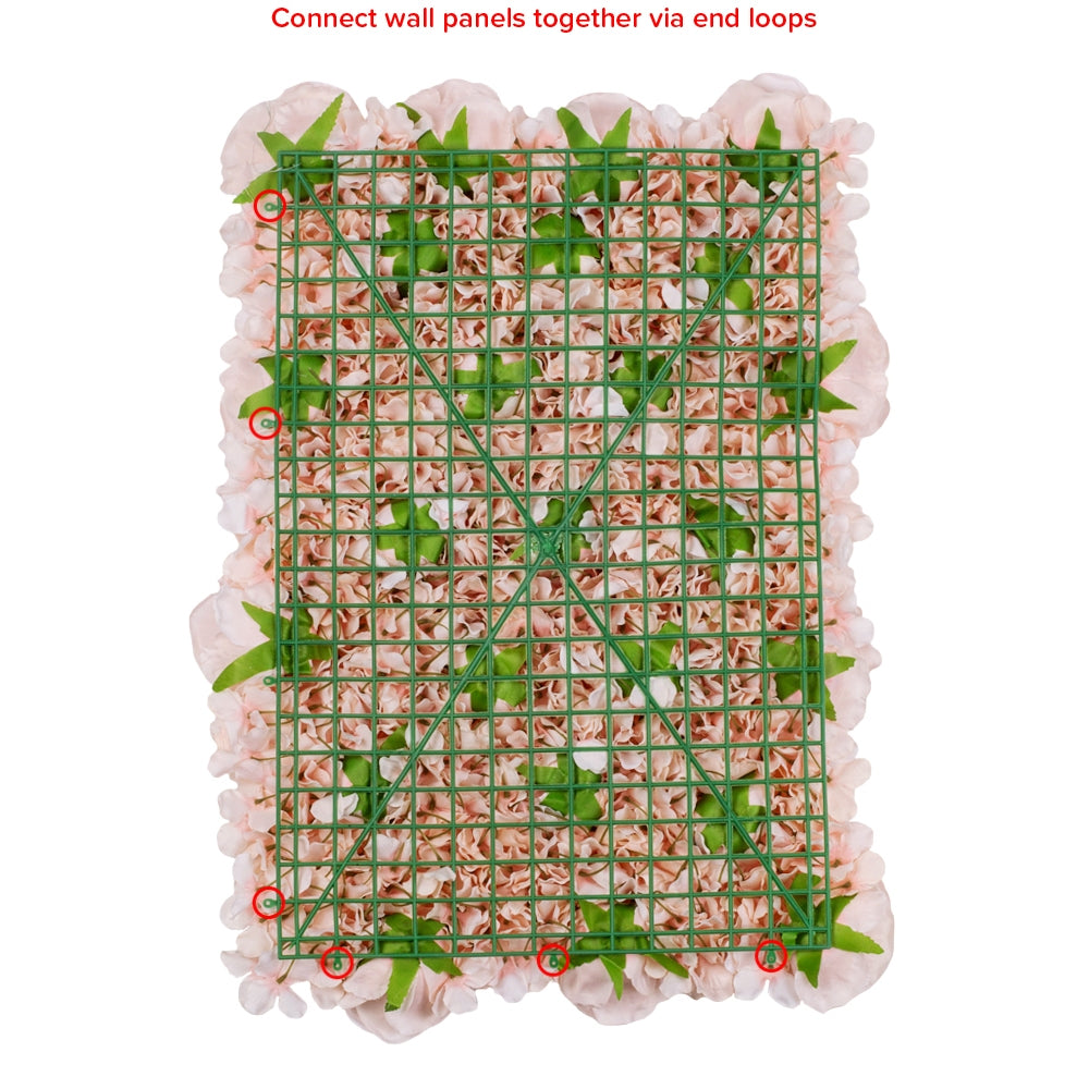 Worried about set up? Don't be! Assembling our Silk Rose/Hydrangeas Flower Wall Backdrop Panels couldn't be easier. Before purchasing, measure out the footage of the space you'd like to cover. Once you have the total area order how many panels you'll need to cover up the area. As mentioned, our Silk Rose/Hydrangeas Flower Wall Backdrop Panels feature a bendable plastic grid backing, so cutting them down to size is no challenge with a pair of scissors. Once your panels are prepped simply use command hooks, thumbtacks, nails, screws, or staples to attach panels to a solid wall. For freestanding systems, zip ties, pipe cleaners, floral wire, Velcro straps or S-hooks can be used to secure them to the uprights and crossbars. The method you use to hang your Silk Rose/Hydrangeas Flower Wall Backdrop Panels will depend on your personal preference and backing.