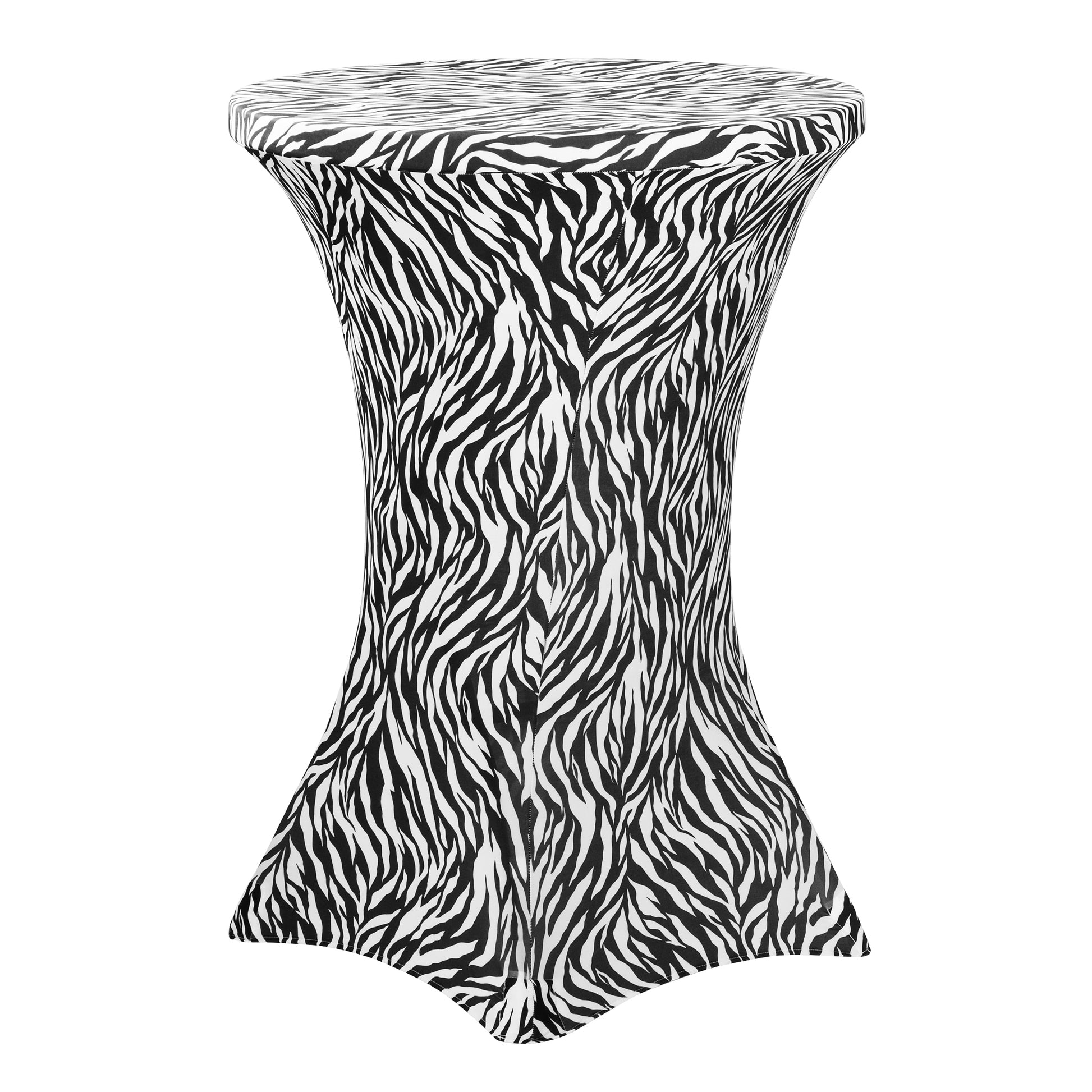 Give your happy hour cocktail tables the glitz and glam they deserve with our Zebra Spandex Cocktail Table Cover 30" Round - Black & White. These zebra-printed spandex cocktail table linens will easily transform highboy tables at cocktail hours. Whether you are celebrating a wedding, anniversary, bridal shower, or birthday, you want the occasion to be a memorable one. That means the table decor at your event should be spectacular, down to the finest detail. Some venues can ruin that perfect aesthetic with their bland and uninspired table linen selections. Tablecloths are used to conceal drab seating, yet a cover alone does not have the power to glam up your seating arrangement. Spandex table linens easily transform your event space with flair and ease.