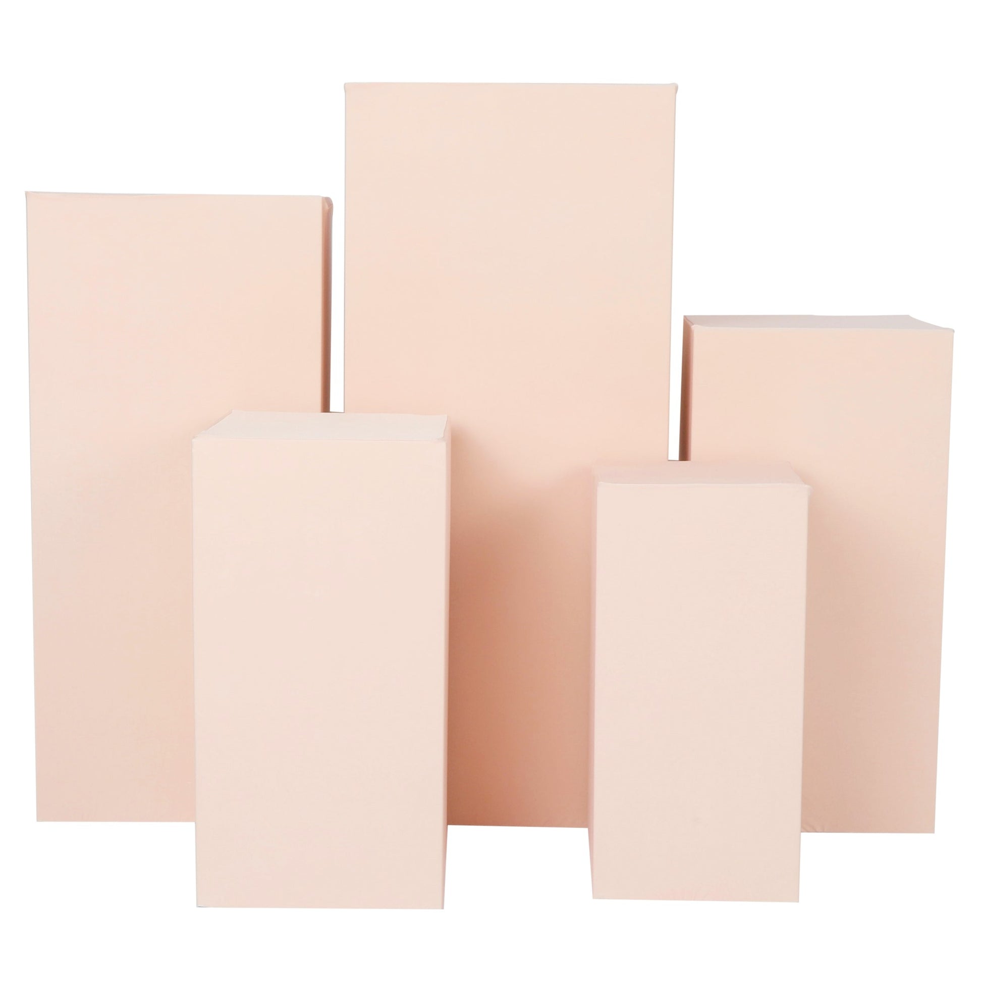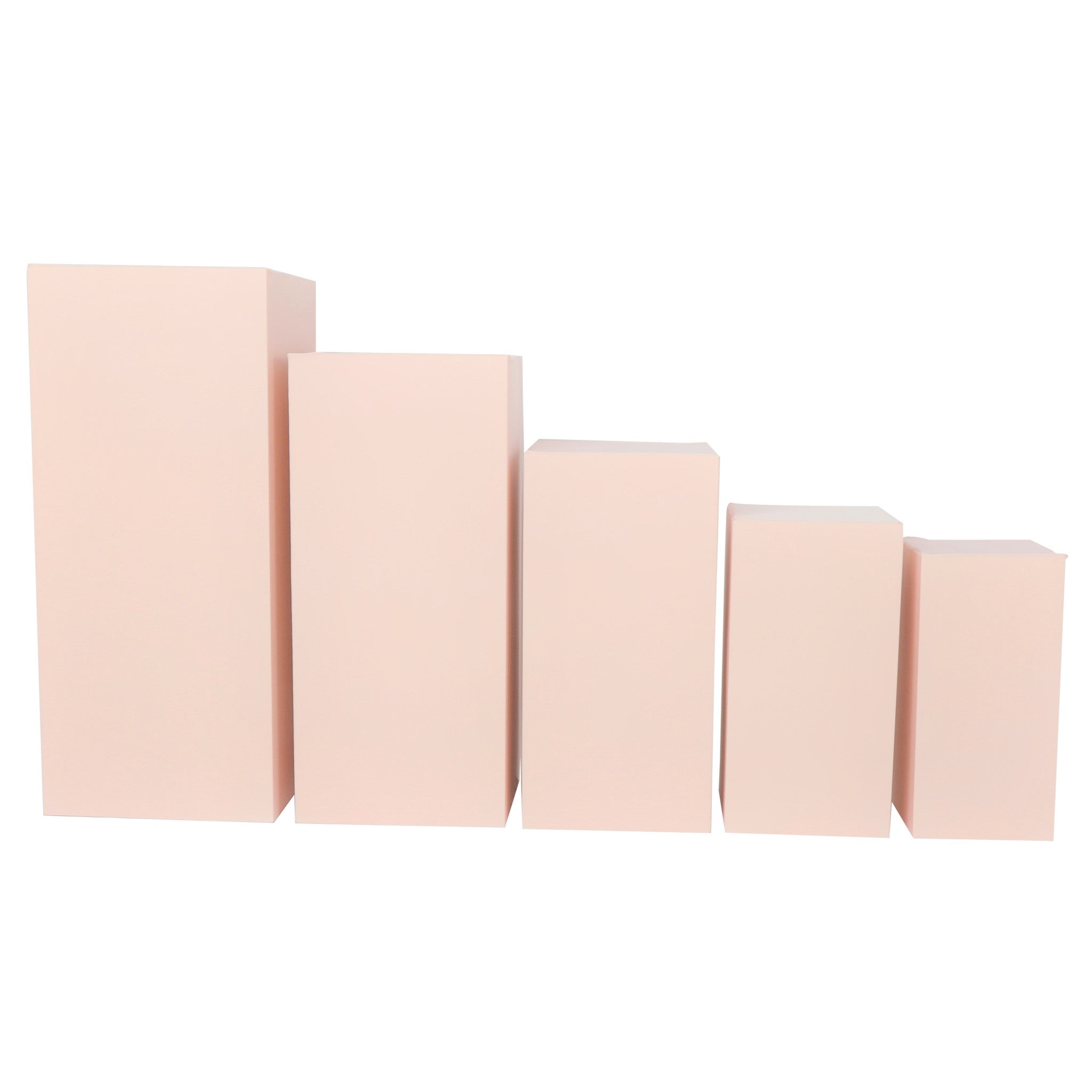Show off an enhanced dessert table design and the presentation for your backdrops at event setups with our Spandex Pillar Covers for Metal Square Pedestal Stands 5 pcs/set in Blush/Rose Gold!