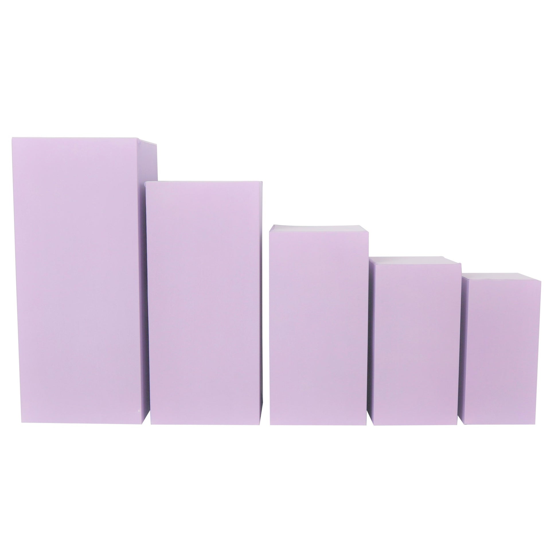 Elevate your event decor with the 5-piece square set of lavender pedestal display stand covers. They add a touch of elegance and sophistication to any occasion. To enhance their appeal and ensure a seamless presentation, consider adding the 5 pcs cylinder pedestal spandex pillar covers.