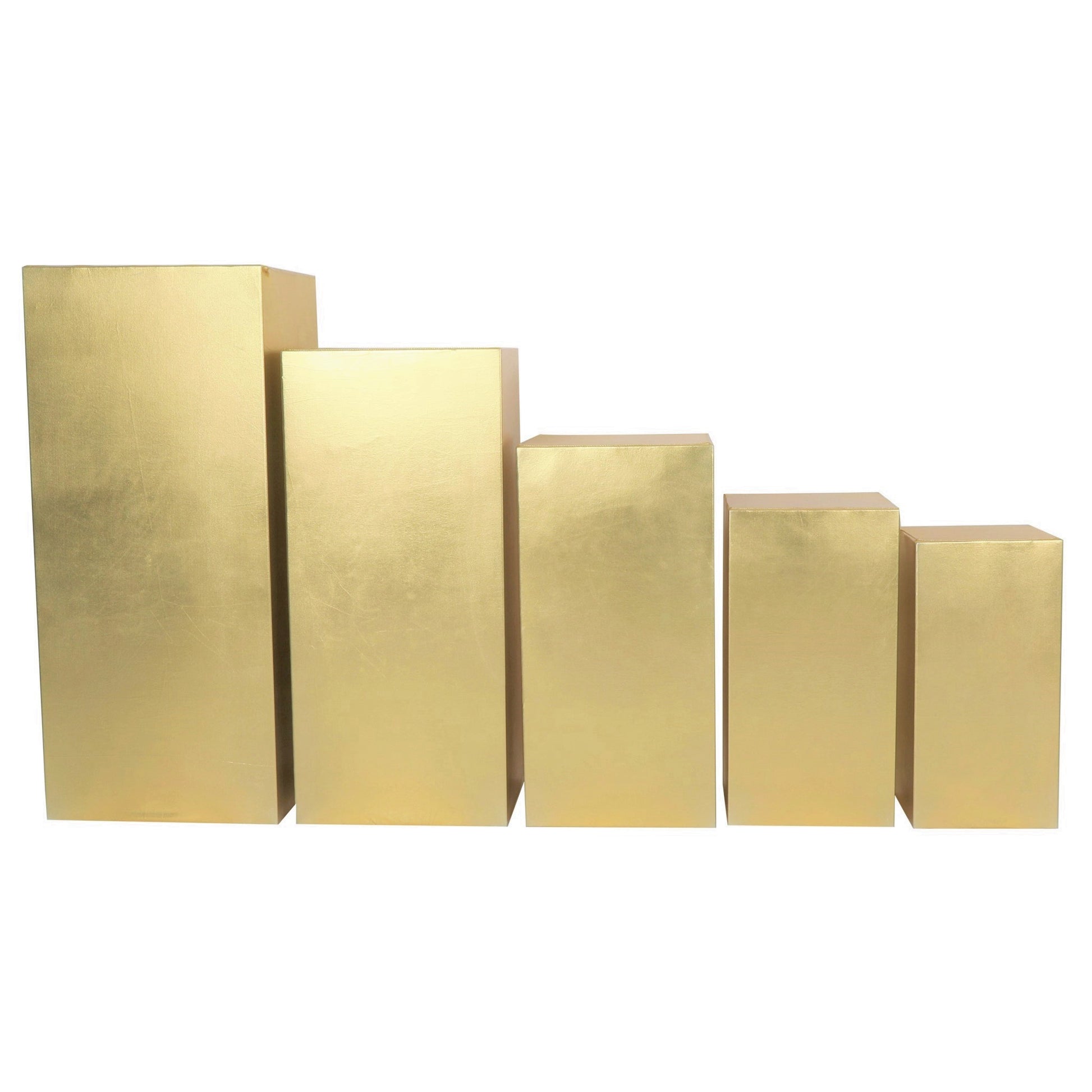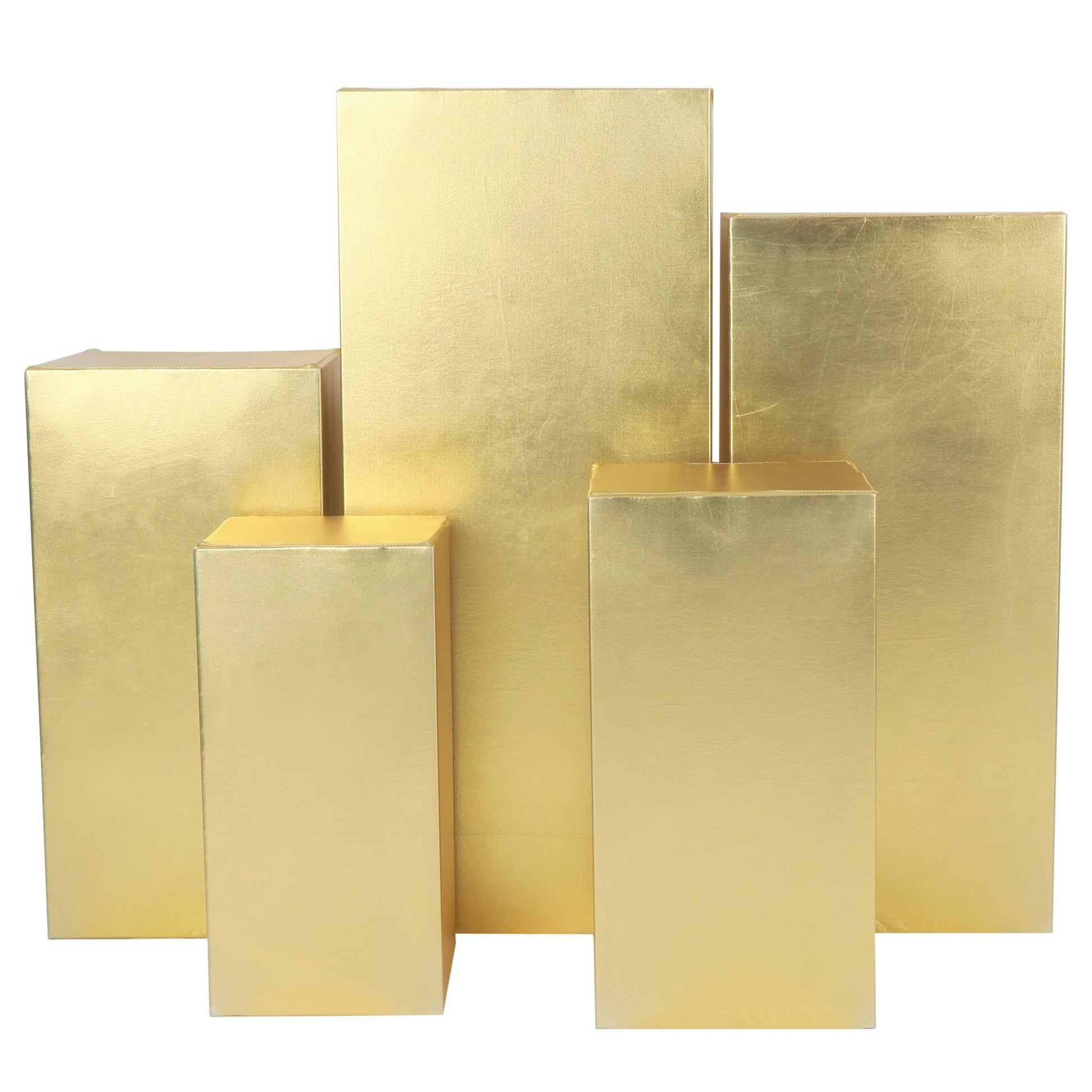Elevate the look of your square pedestal stands event decor with the 5-piece set of metallic gold pedestal display stand covers. They add a touch of elegance and sophistication to any occasion. To enhance their appeal and ensure a seamless presentation, consider adding the cylinder pedestal spandex pillar covers in 5 for added dimension.
