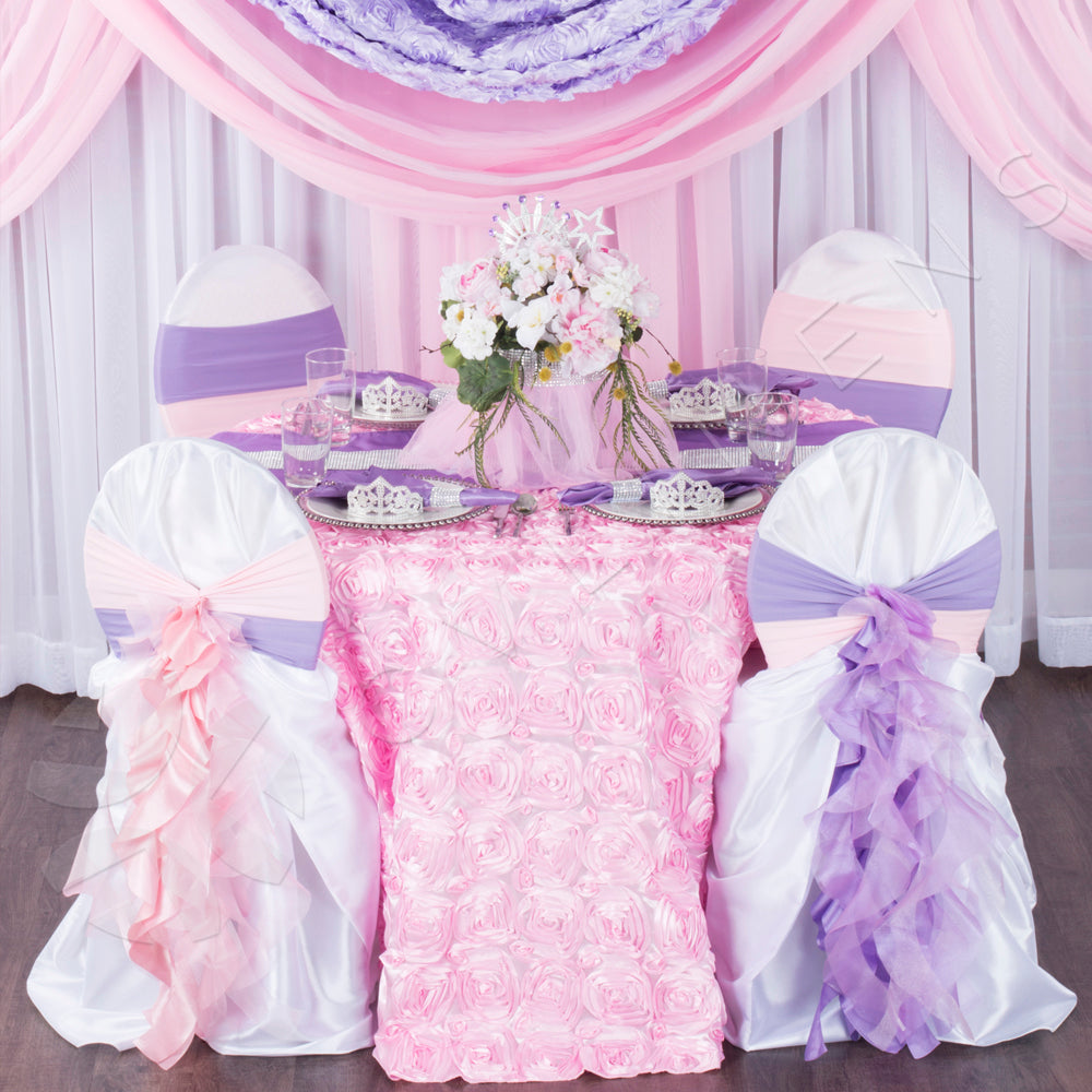 Lavender is a soft shade of purple that exudes grace and elegance. Its delicate and airy nature creates a dreamy and inviting atmosphere, perfect for both classic and modern themes. Whether you use it as a backdrop for table decor or as a stylish accent to finish your design, lavender is a great choice. Perfect for romantic weddings galas, anniversaries, and stylish corporate events.