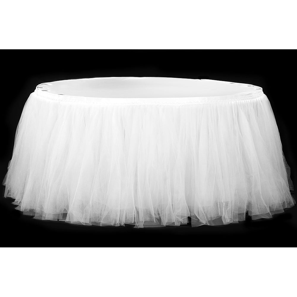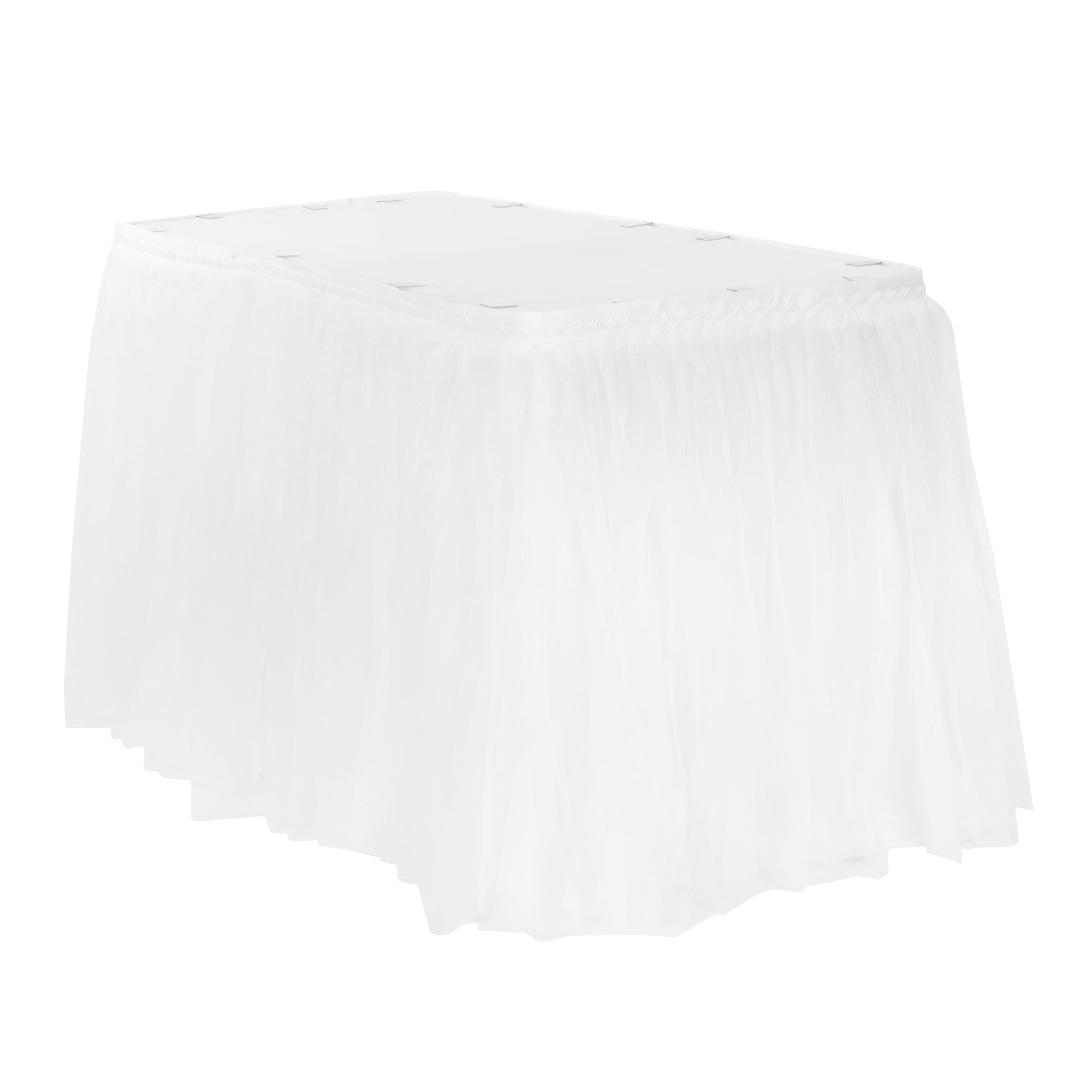 Take the DIY guesswork out of creating a full tulle table skirt with our 14ft Tutu Table Skirt in White! Each table skirt features individual strands of ample, reinforced mesh upon a thick and durable lamour satin band. As with traditional table skirts there is a 1" velcro strip sewn into the top, table-facing side, and a tablecloth will need to be purchased to cover the top of your table. Effortlessly add feminine charm and fun to your event with our Tutu Table Skirts and save yourself the hassle of a DIY project! This wholesale table skirt is perfect for ballerina-inspired parties, kid's parties, bridal showers, quinceaneras, and even wedding receptions.