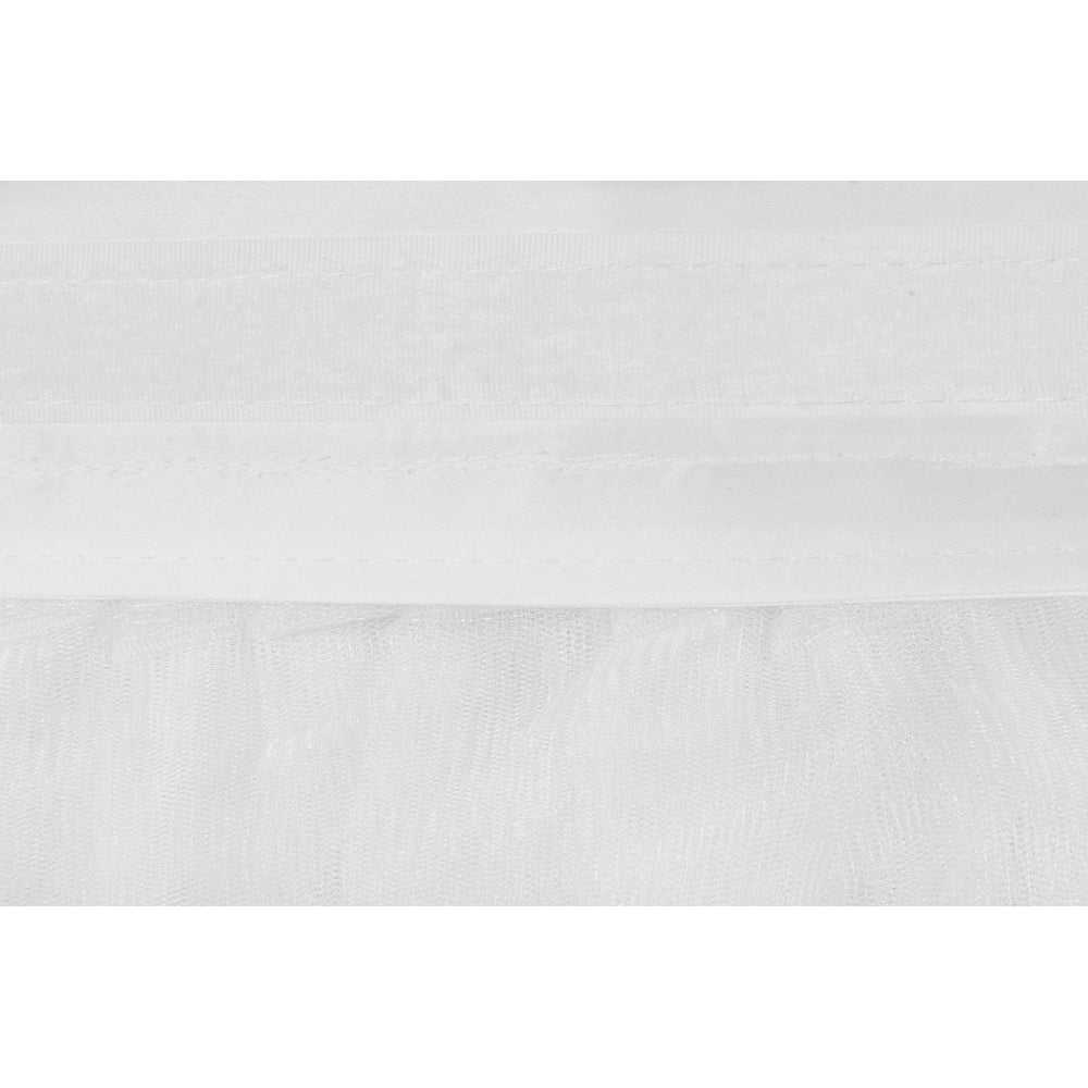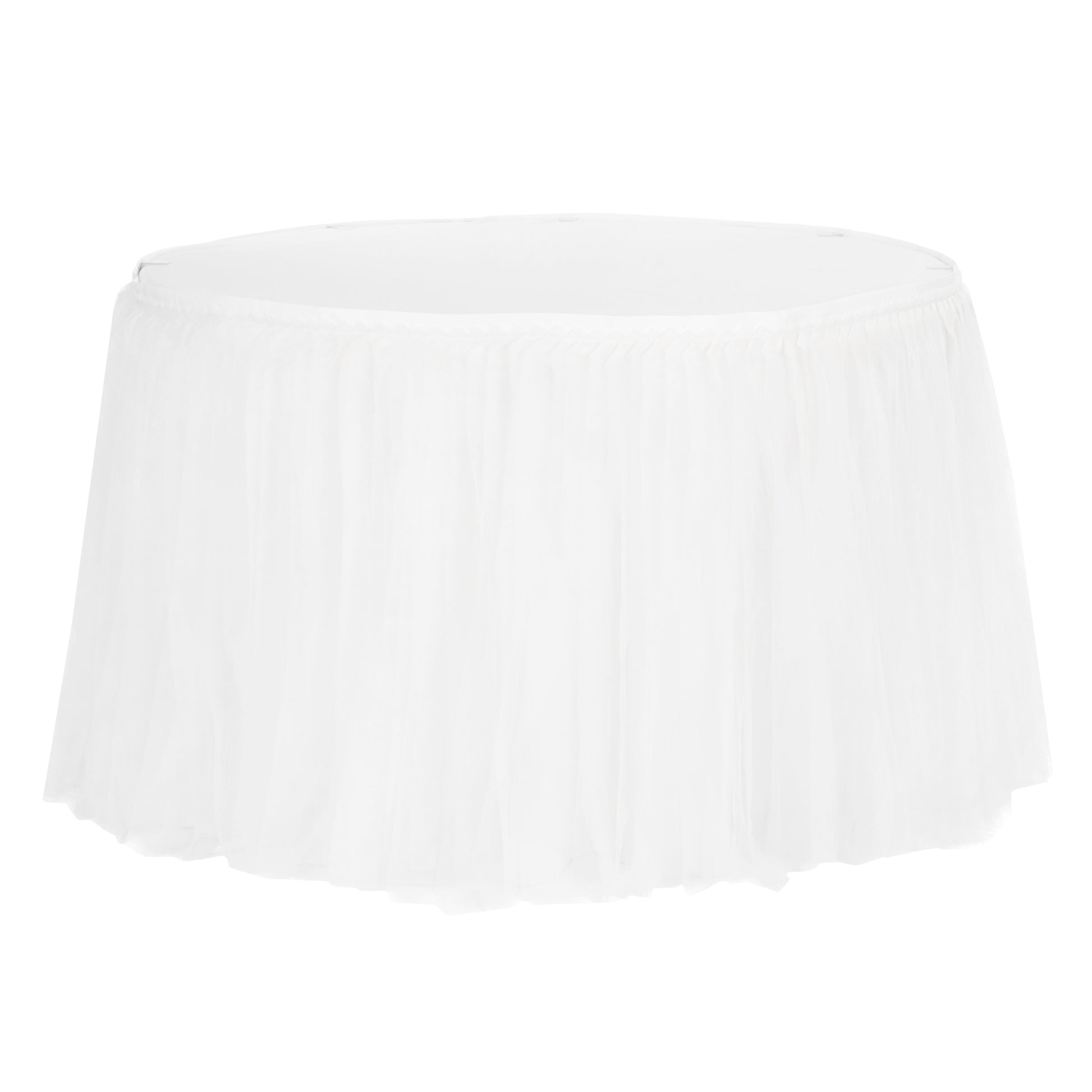 Take the DIY guesswork out of creating a full tulle table skirt with our 21ft Tutu Table Skirt in White! Each table skirt features individual strands of ample, reinforced mesh upon a thick and durable lamour satin band. As with traditional table skirts there is a 1" velcro strip sewn into the top, table-facing side, and a tablecloth will need to be purchased to cover the top of your table. Effortlessly add feminine charm and fun to your event with our Tutu Table Skirts and save yourself the hassle of a DIY project! This wholesale table skirt is perfect for ballerina-inspired parties, kid's parties, bridal showers, quinceaneras, and even wedding receptions.