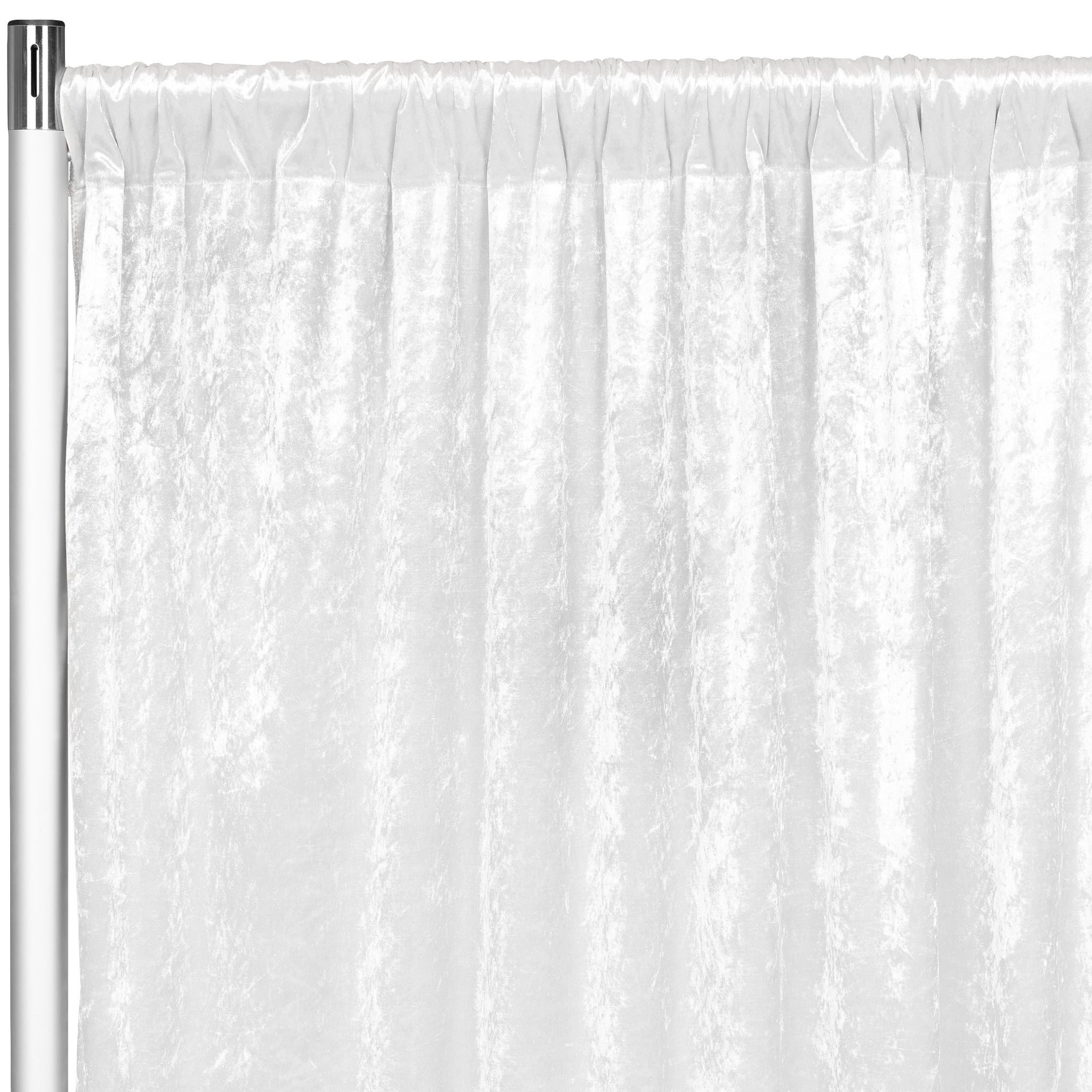 A question that often arises with event decorators, party planners, and brides is, what is the best fabric to use for the wedding reception or ceremony drapery? Our White Velvet 14ft H x 52" Drape/Backdrop Curtain Panel stylishly serves as a luxe setting that brings an upscale atmosphere to your special day! Velvet brings about a whole new level of textural dimension to your wedding decor scheme. The warm and soft sheen of velvet helps create intimate vibes when paired with candlelight and complementing blooms. It's a transitional event fabric that can play a pivotal role in your big day as a ceremony backdrop, or it can take on a more low key vibe when used as a photo backdrop. A velvet stage curtain can be used at your ceremony to highlight a live band as well as serve as a wall covering to bring maximum attention when highlighting the head wedding party table.