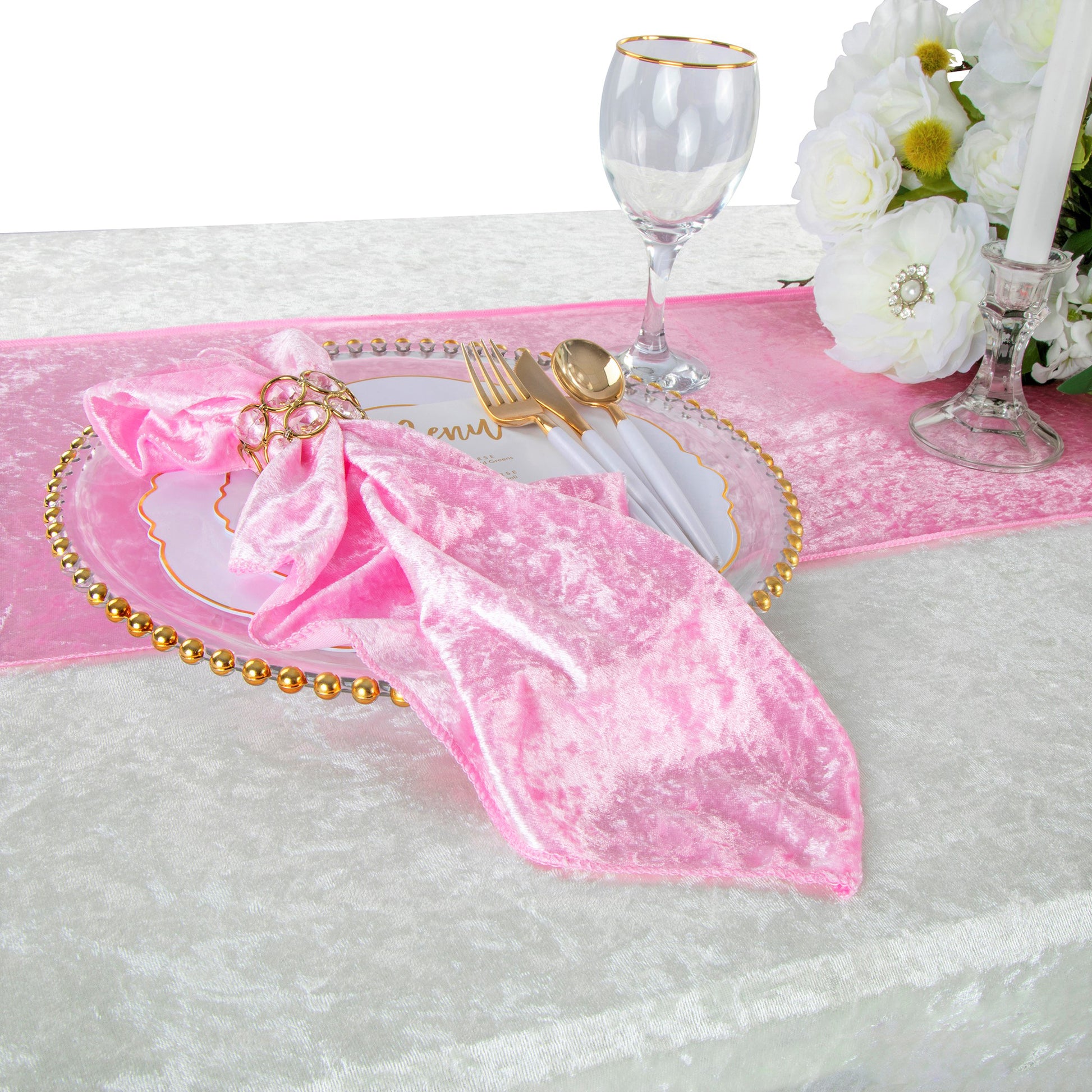 Made out of velvet, these tablecloth napkins have a textured feel and soft sheen. Velvet is a popular fabric option for event decorators. It evokes a touch of elegance and sophistication in any event space. Easily get a polished look with the classic shade of pink.