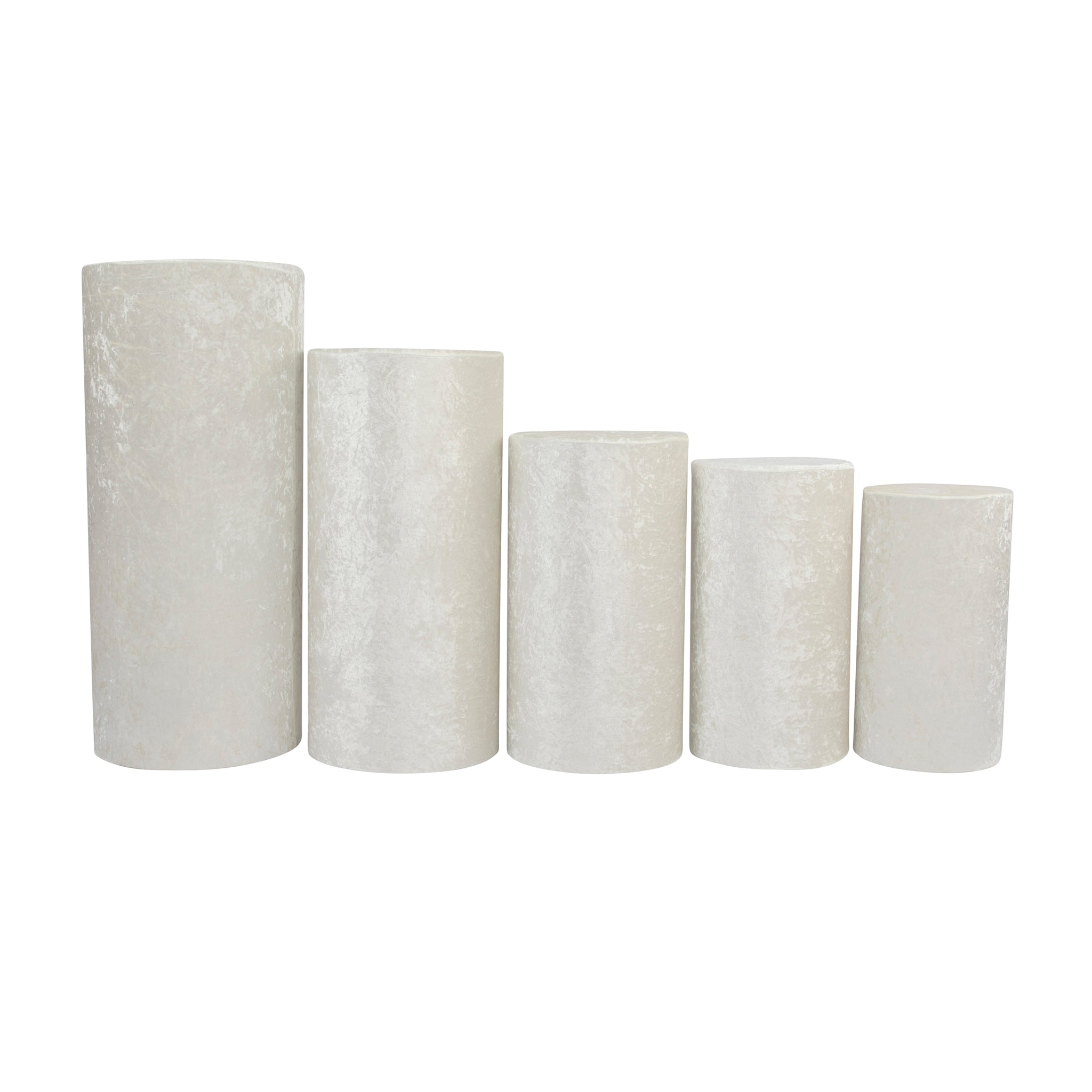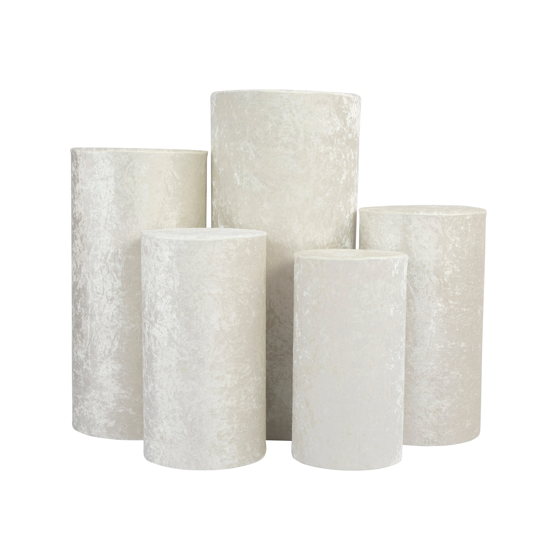 Create an enhanced dessert table design and presentation for your backdrops at special events with our Velvet Covers for Metal Cylinder Pedestal Stands 5 pcs/set - Ivory! These elegant velvet covers for cylinder pedestals bring a heightened visual appeal to blend more seamlessly with your event setups. The purpose of using a pillar cover is to accentuate the feel and look of cakes, desserts, and pastries on a metal pedestal dessert table as it highlights and compliments the colors and theme of your party.
