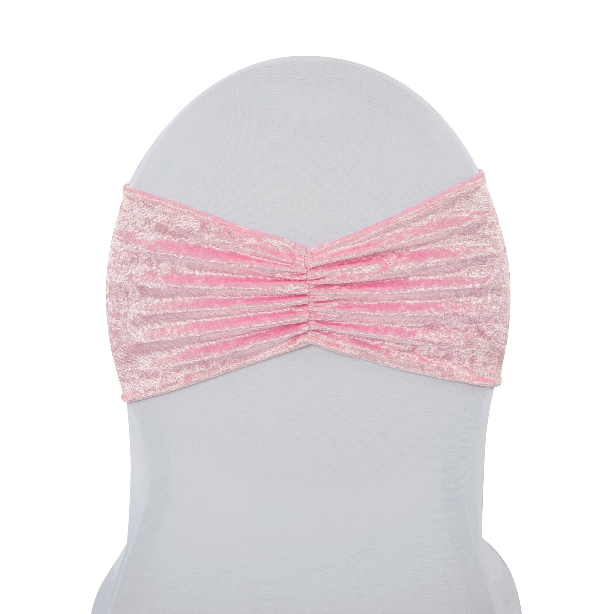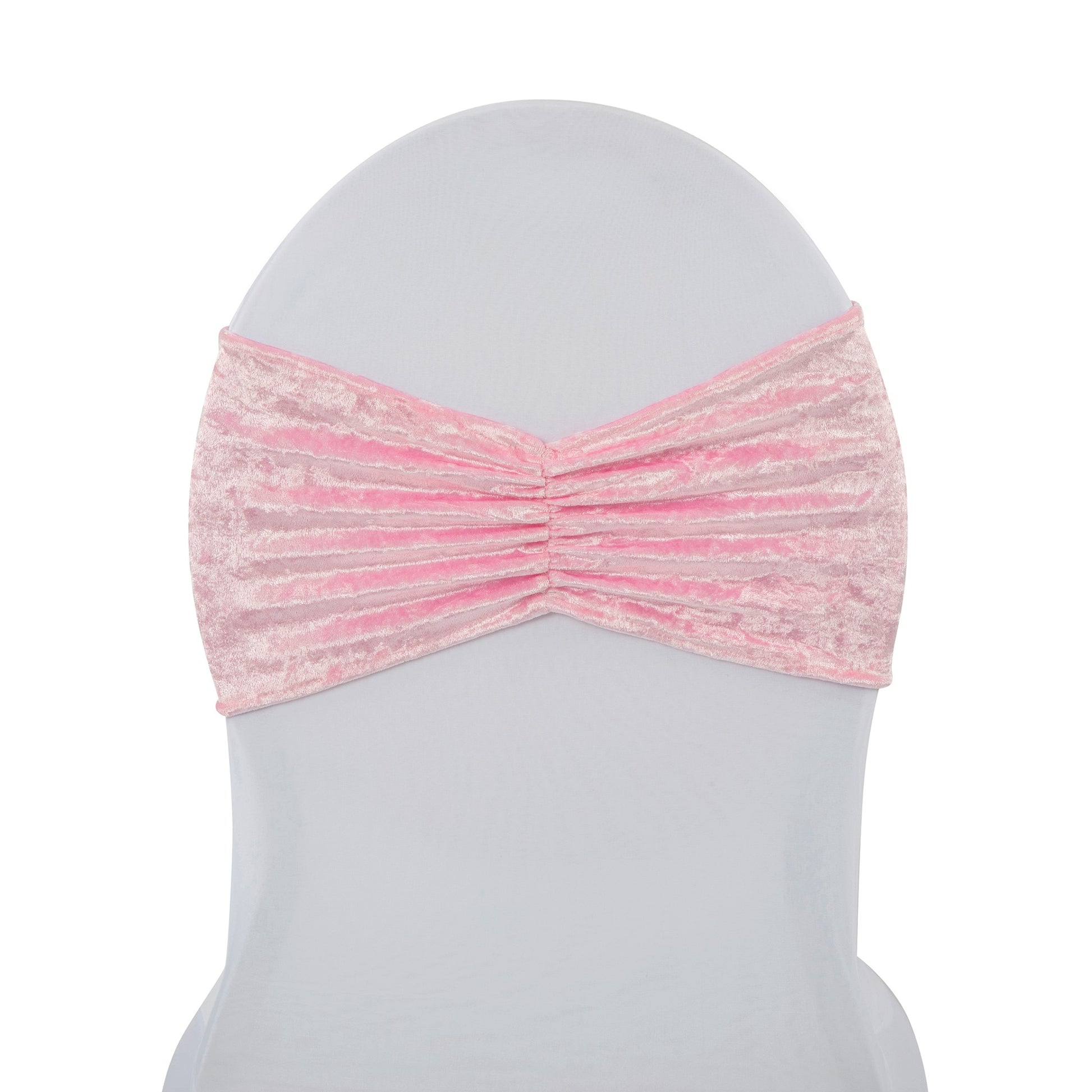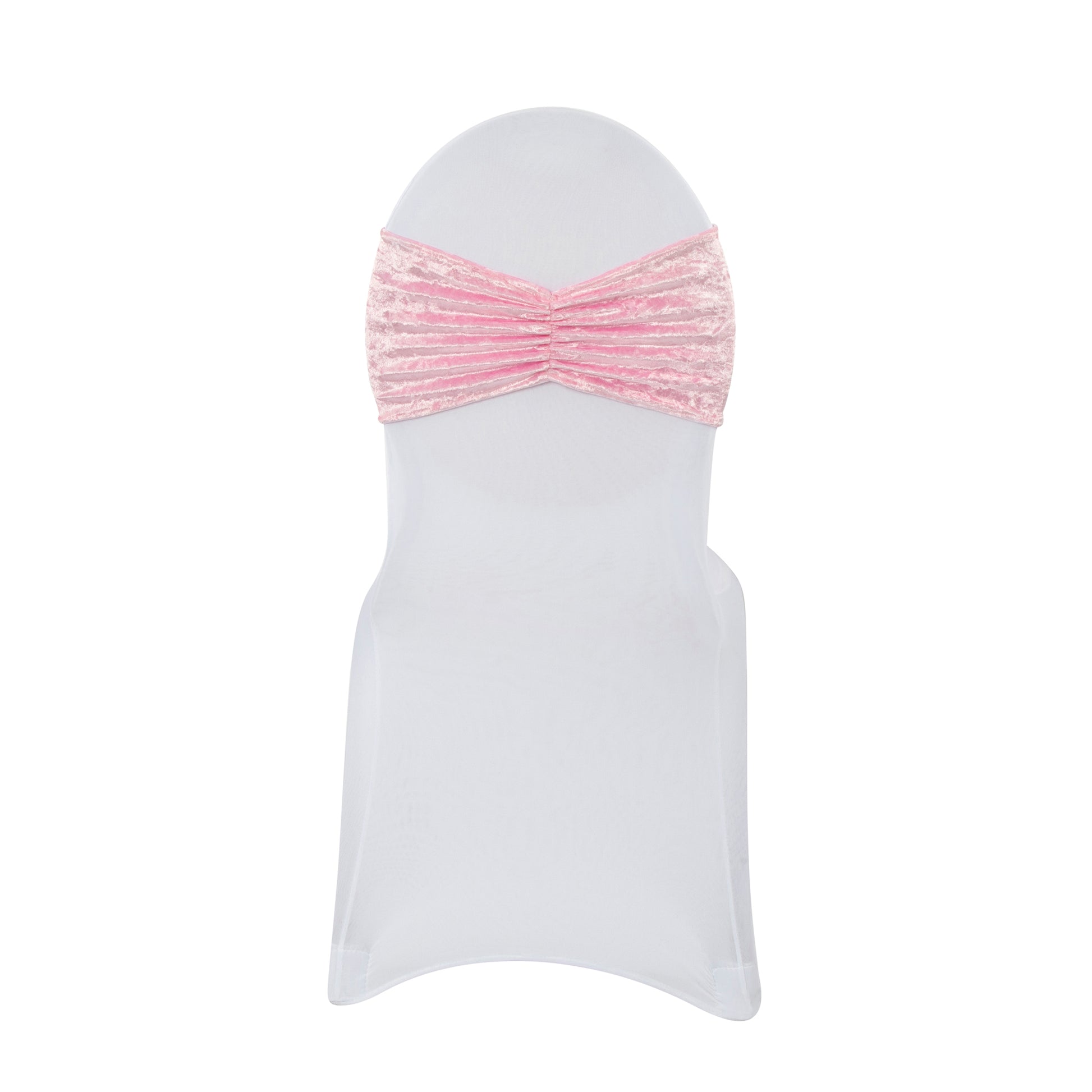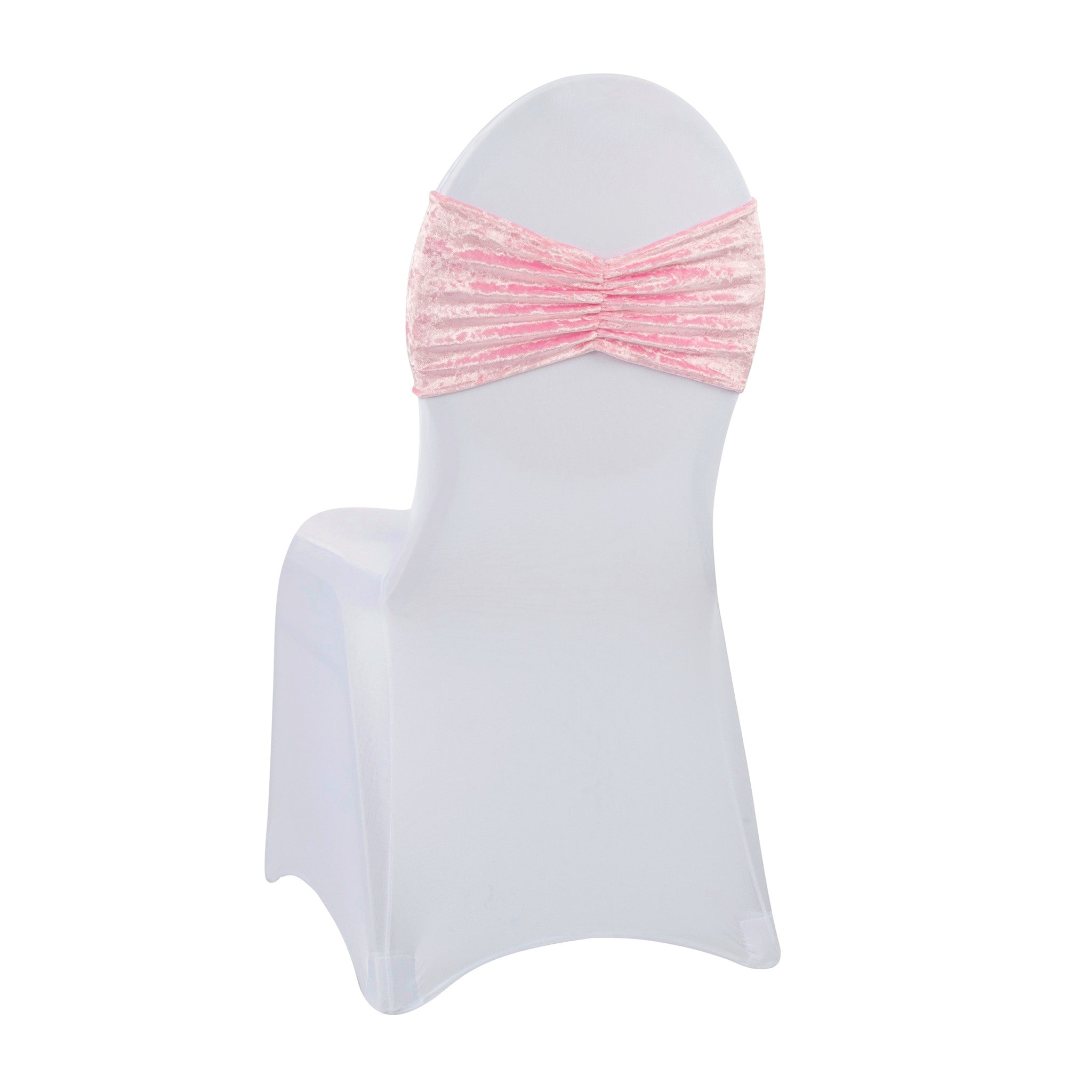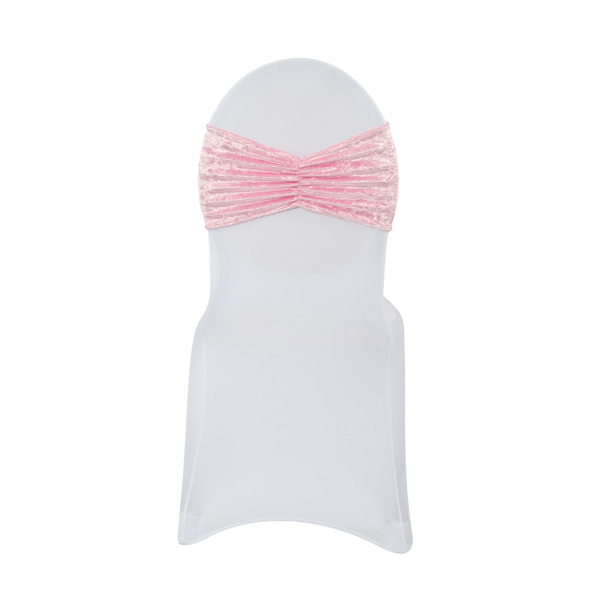 At CV Linens™, our collection of stretchable chair bands represents fused style and functionality. The Pink Velvet Ruffle Stretch Chair Band is a prime example.