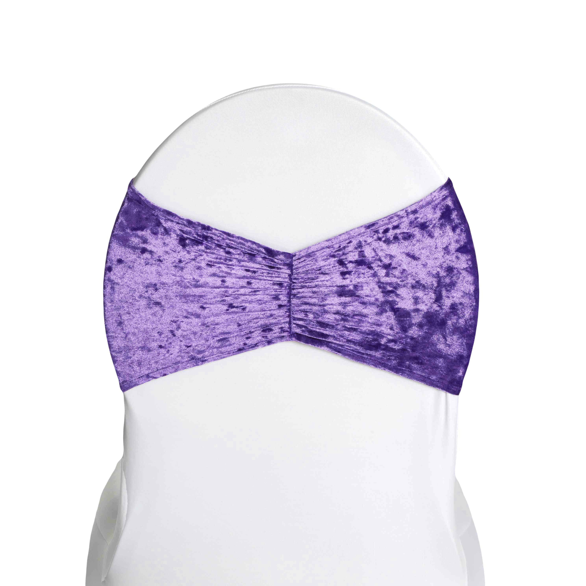 At CV Linens™, our collection of stretchable chair bands represents fused style and functionality. The Purple Velvet Ruffle Stretch Chair Band is a prime example.
