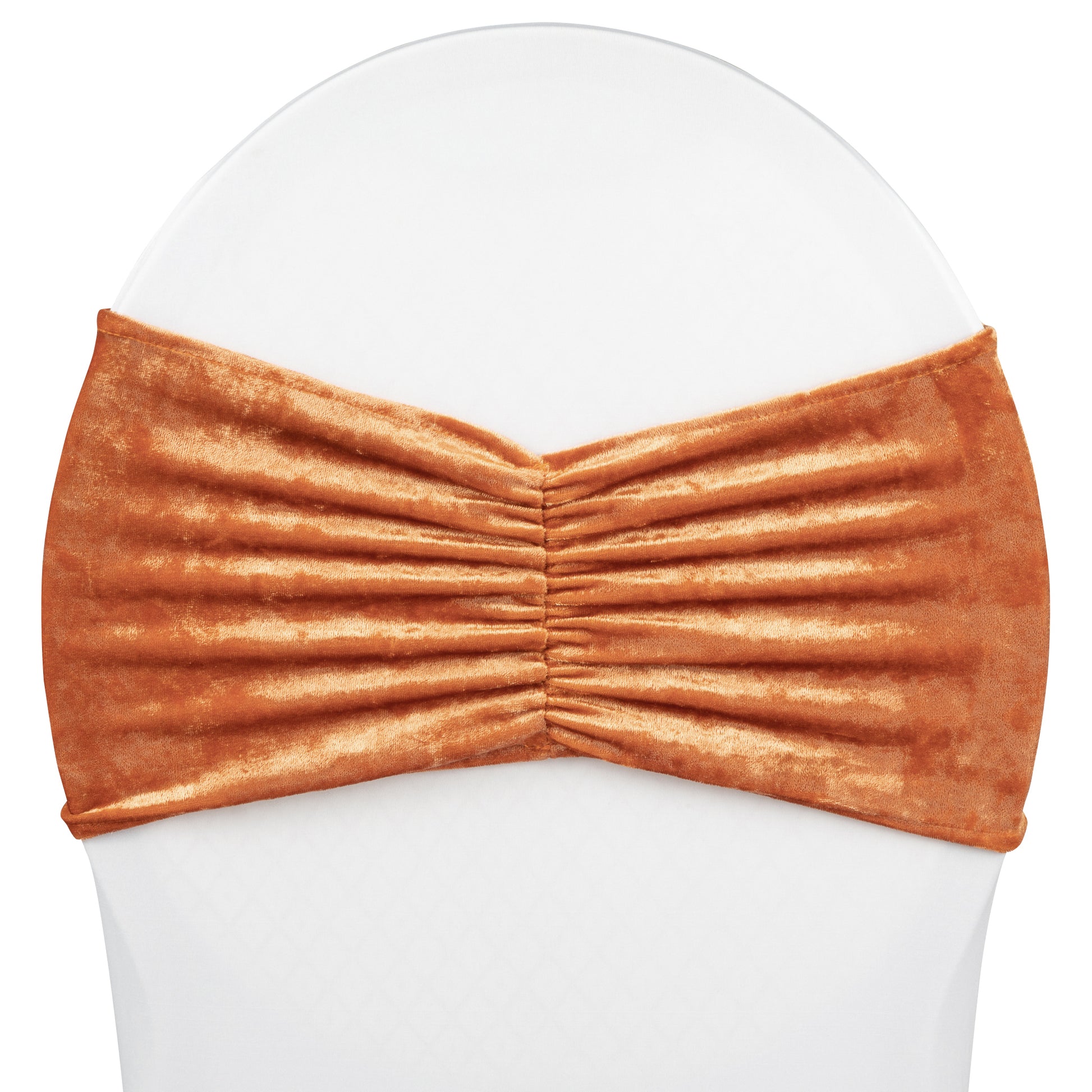 At CV Linens™, our collection of stretchable chair bands represents fused style and functionality. The Rust Velvet Ruffle Stretch Chair Band is a prime example.