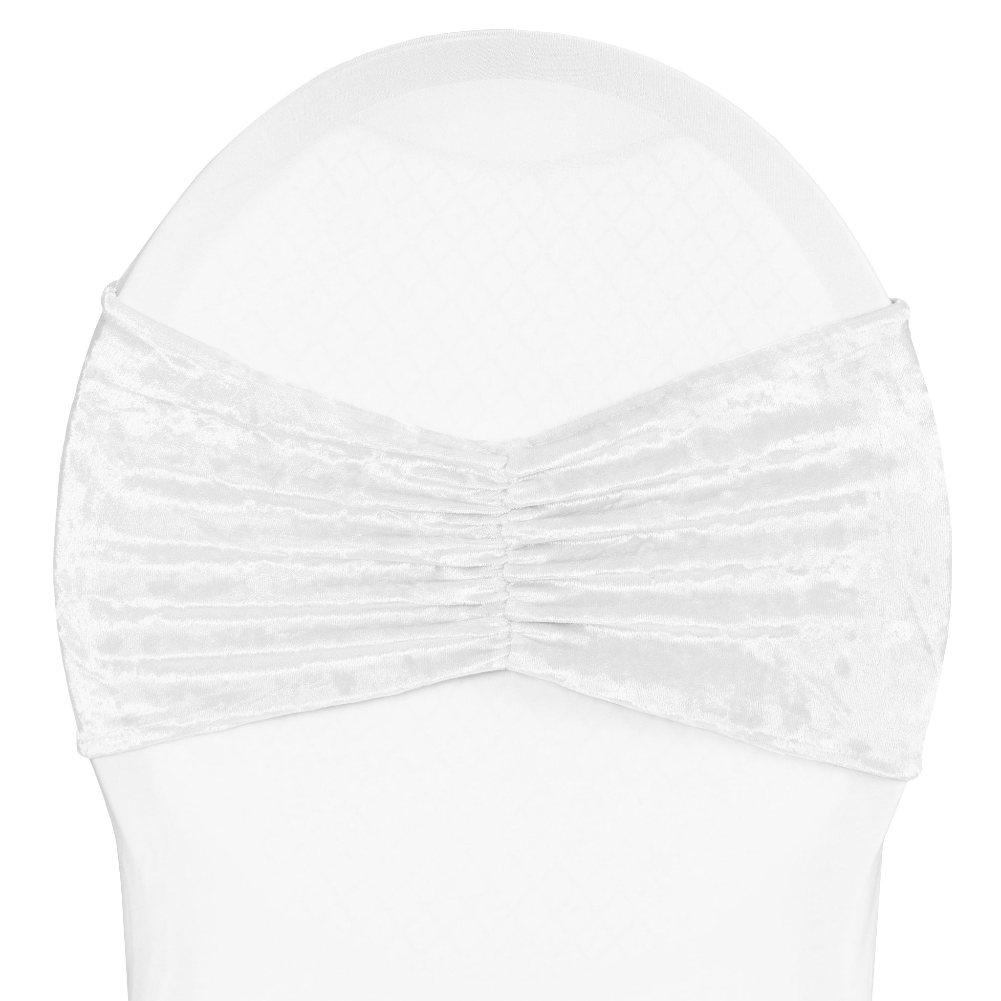 At CV Linens™, our collection of stretchable chair bands represents fused style and functionality. The White Velvet Ruffle Stretch Chair Band is a prime example.