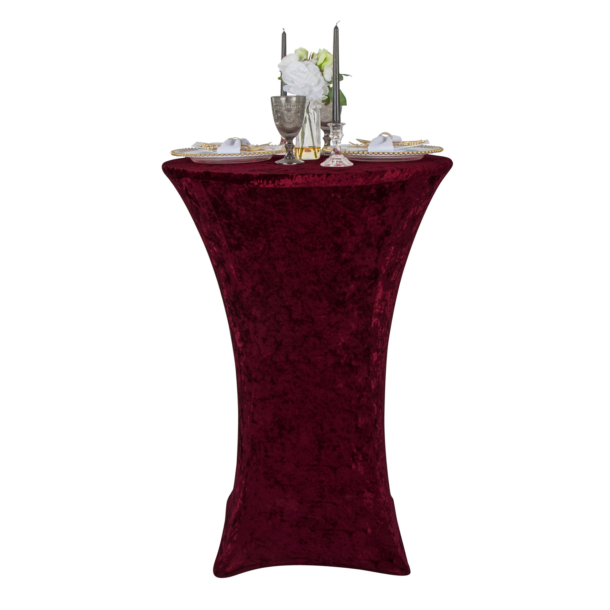 Our slip-on spandex table covers are stress-free and a breeze to decorate with. Each table will only take a few minutes to set up! Soft velvet cocktail tablecloth covers the top and sides of your table and features four reinforced pockets at the feet to ensure each cover doesn't slip out of place during your event.