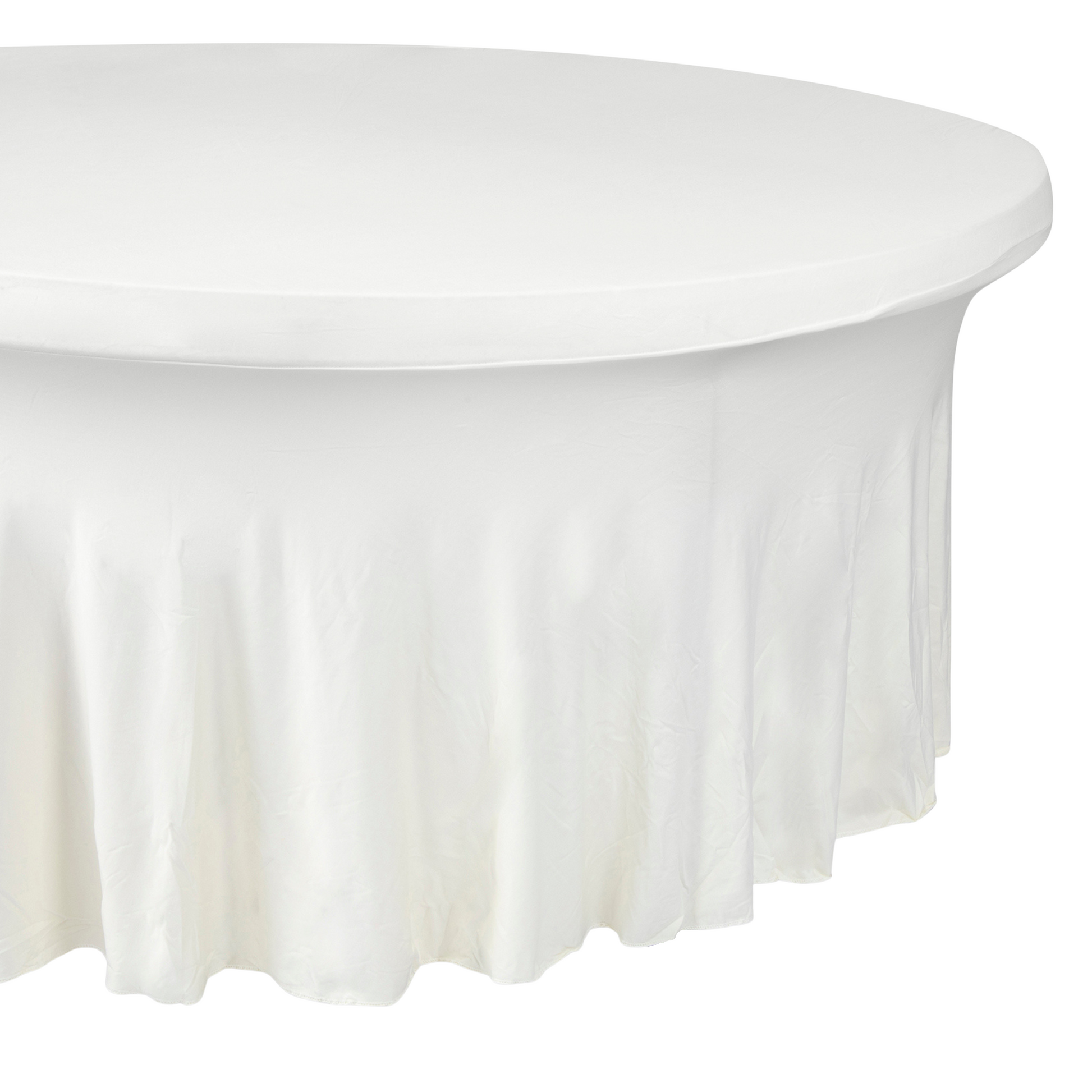 Decorating round banquet tables just got easier with the Wavy Spandex Table Cover 5ft Round - Ivory from CV Linens. This easy-to-use spandex table linen offers the same stretchy and easy-care qualities as stretch spandex table covers, but with a stylish twist. This flowy wavy spandex table cover design differs from traditional fitted spandex table covers by providing a naturally cascading wavy fabric rather than a fitted stretch look. Each spandex slip-on cover only takes a minute to place securely over round tables saving valuable time.