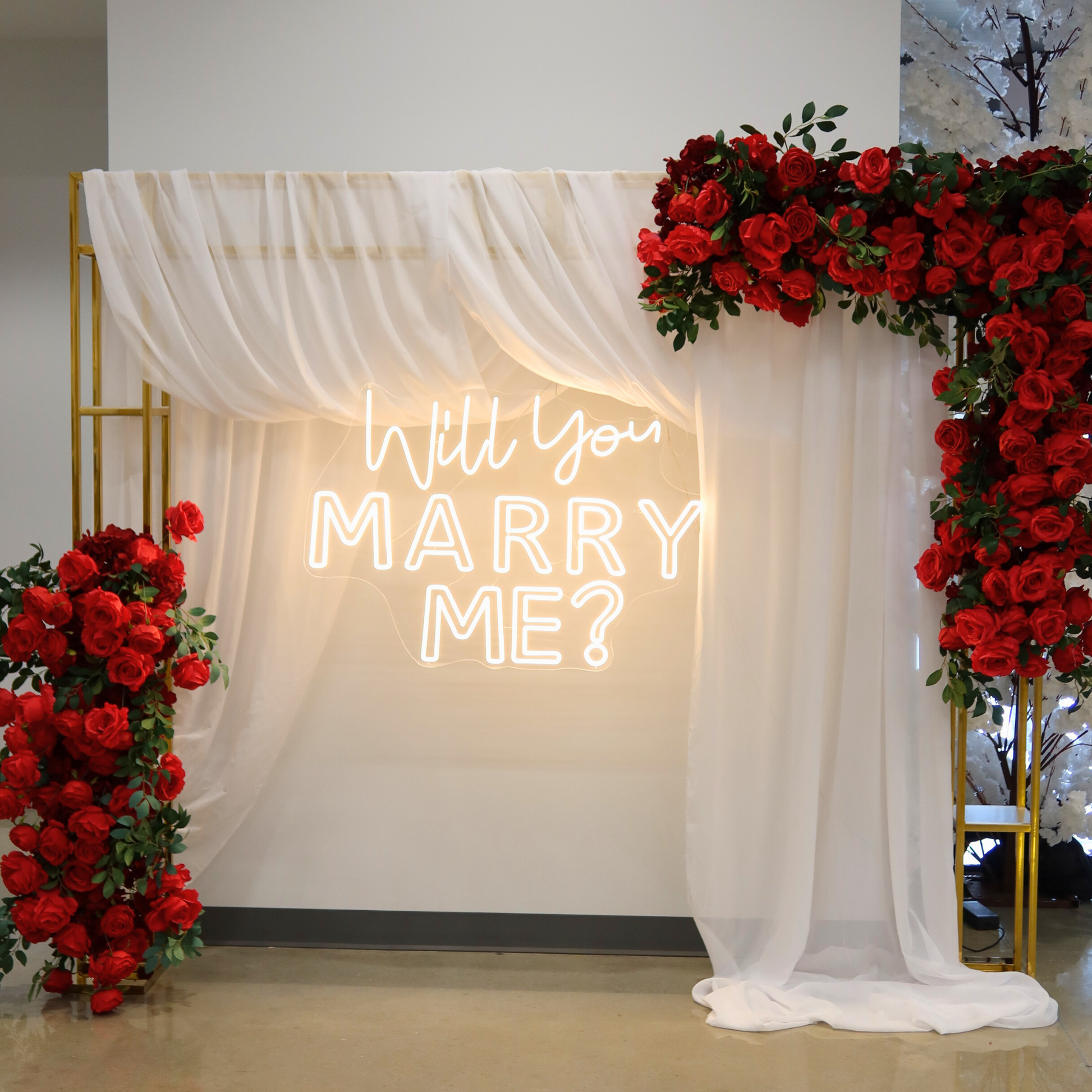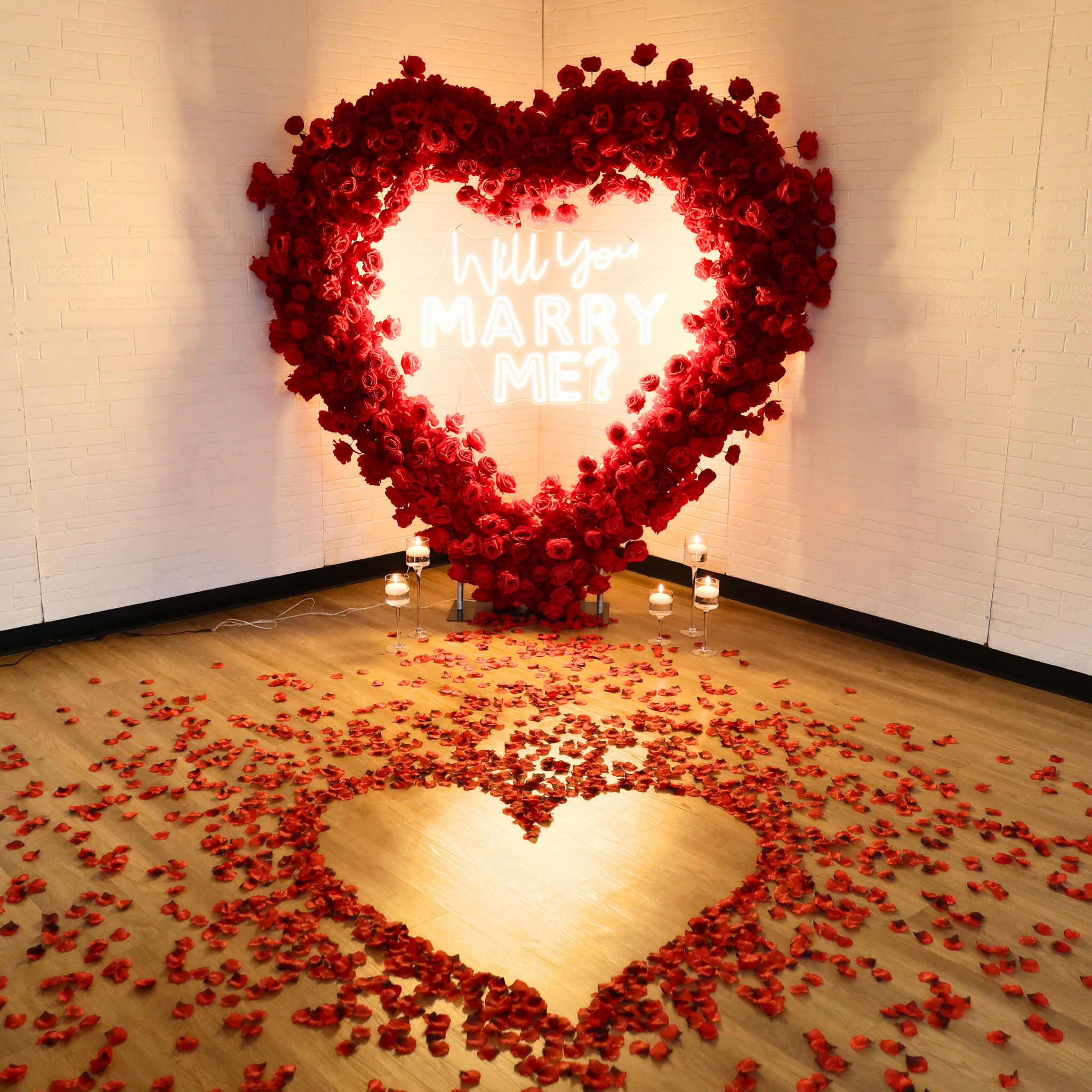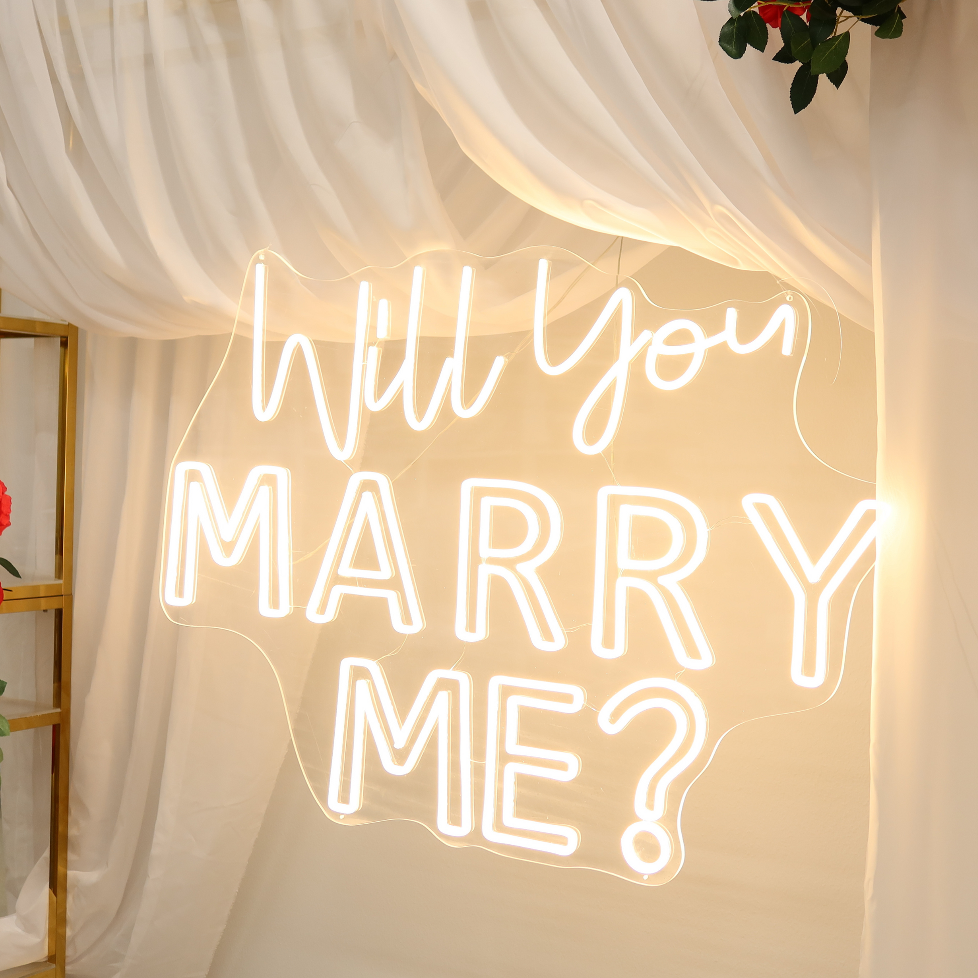 Neon signs emit a soft, romantic glow that can enhance the atmosphere of your event. They create a warm and inviting space for your special moment. Further, decorate the will you marry me sign with artificial silk flowers and petals for a lovelier design.